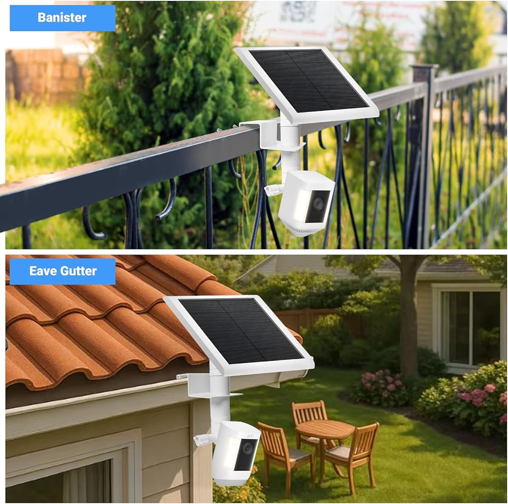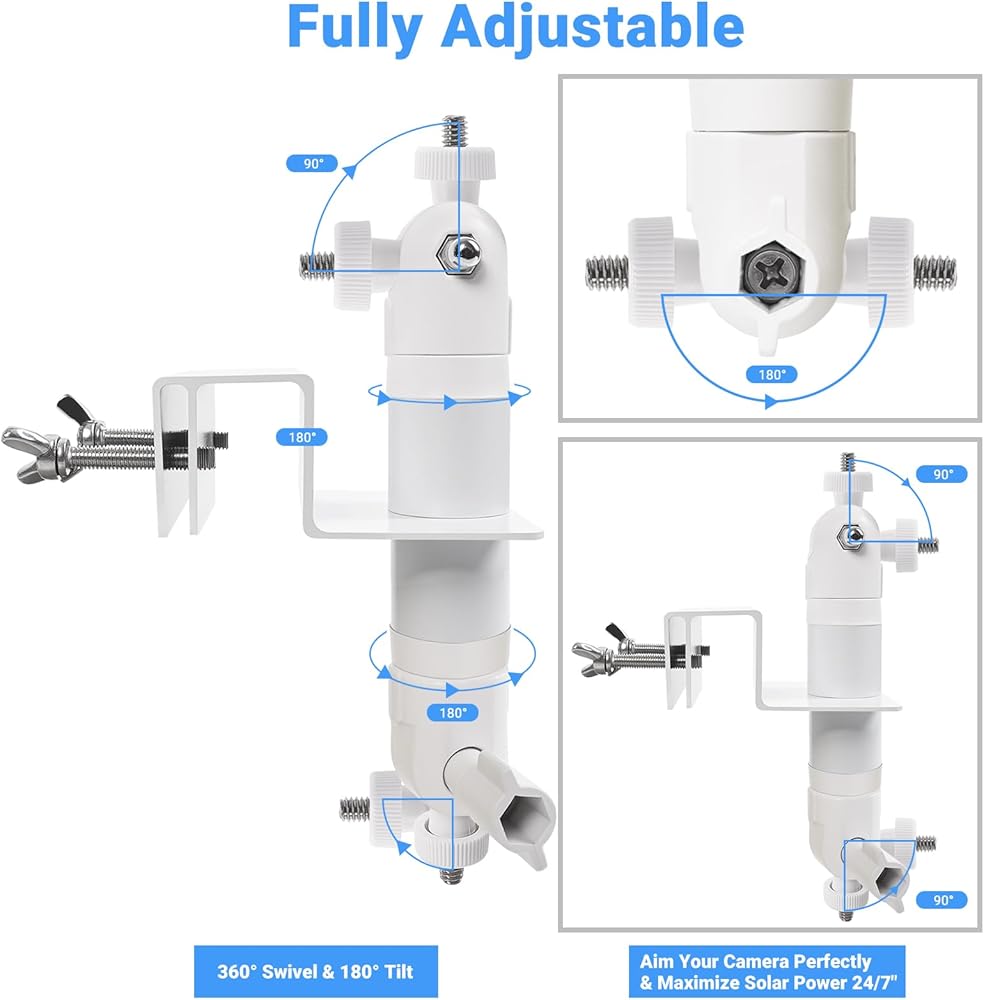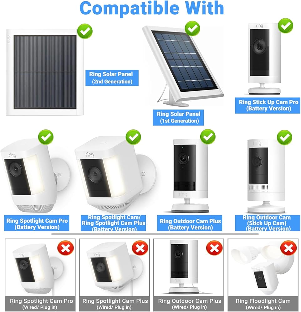 توافق عالمي للكاميرا: يعمل مع الكاميرات الحلقية (الكاميرا الخارجية (كاميرا لاصقة)، كاميرا خارجية بلس، كاميرا لاصقة برو، كاميرا خارجية (كاميرا لاصقة) الجيل الثاني/الثالث، بطارية كاميرا سبوتلايت/برو/بلس) والألواح الشمسية الدائرية (الجيل الأول، الجيل الثاني). متوافق أيضًا مع Blink وArlo وEufy وWyze وTP-Link وTapo وأي جهاز يستخدم حامل لولبي قياسي 1/4 بوصة - وهو حامل تثبيت عالمي متعدد الاستخدامات لأنظمة الأمان