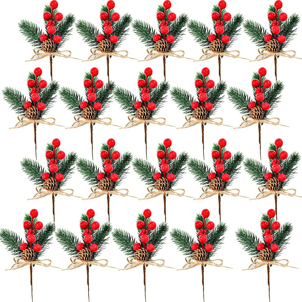20 Pack Artificial Christmas Tree Picks Christmas Red Berries Stems Pine Branches Spray with Pinecones Holly Leaves for DIY Xmas Garland Wreath Ornaments Holiday Décor (Red Berries)
