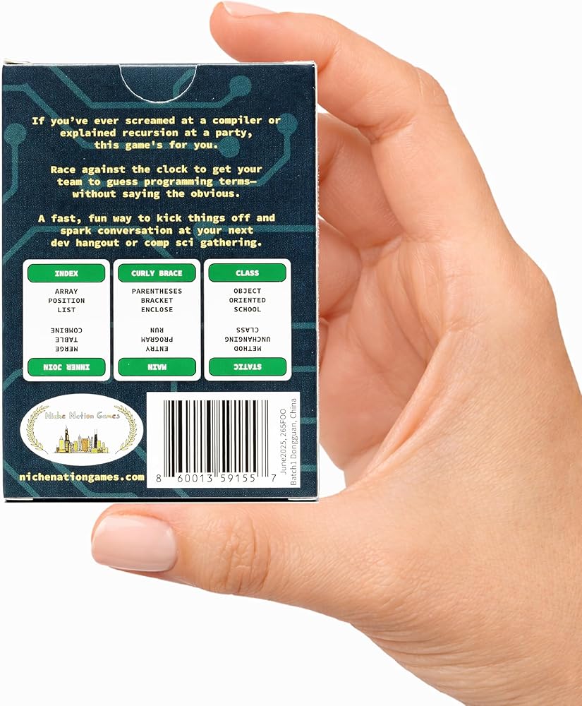 PERFECT ICEBRAKER: Race against the clock to get your team to guess programming terms without saying the obvious (similar to the classic word-guessing game Taboo). Great for dev meetups, office parties, hackathons, conferences, or computer science departments—instantly sparks conversation and laughter.