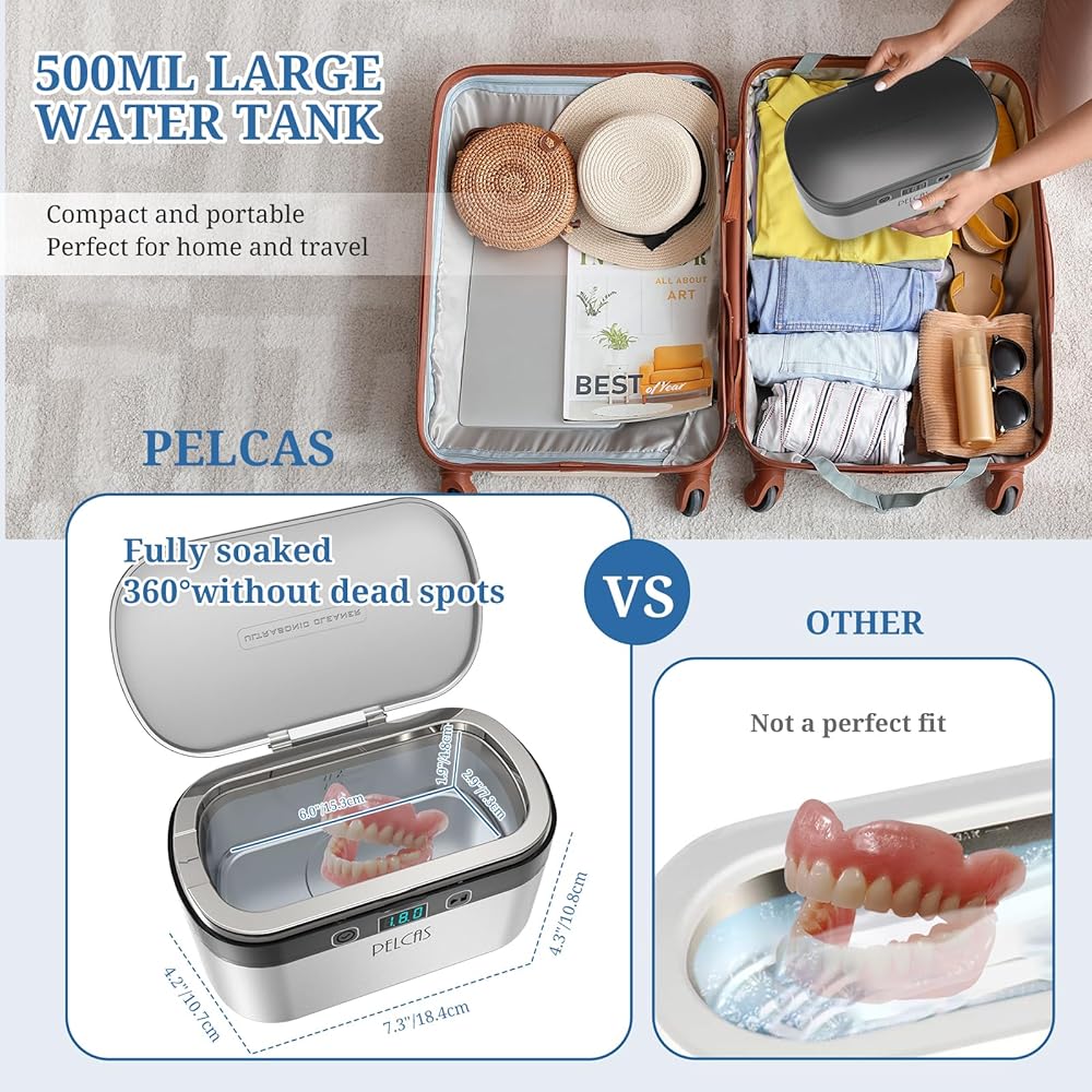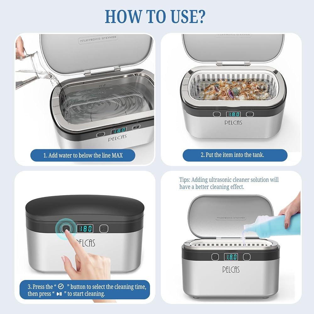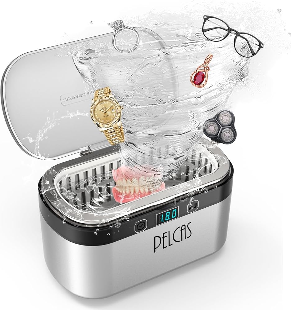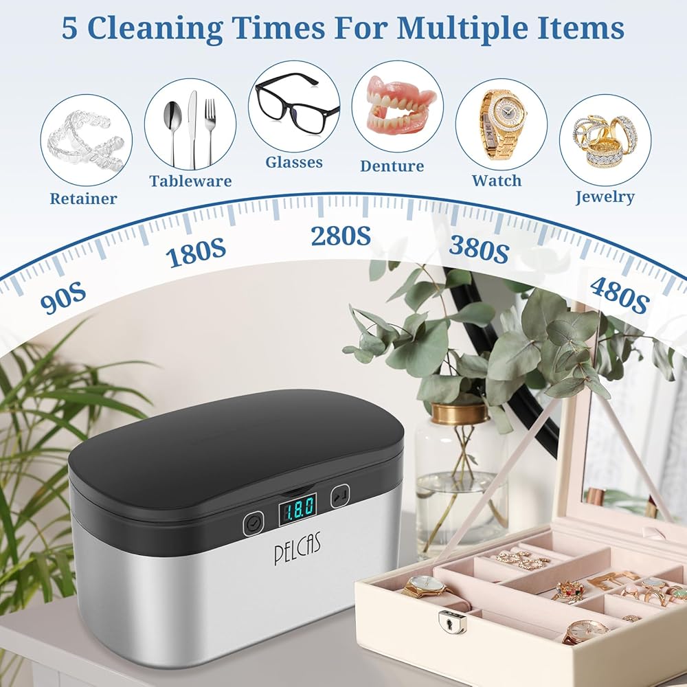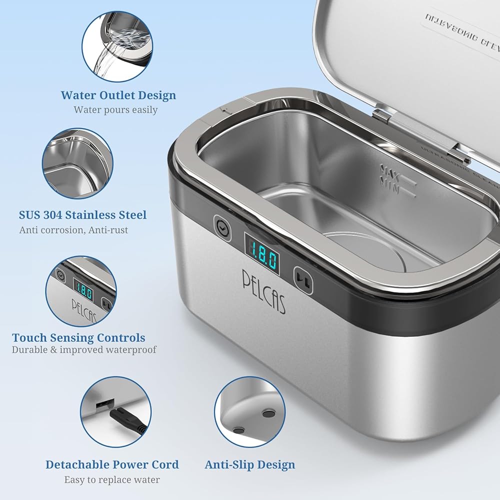 5 أوضاع للوقت وضجيج منخفض: يحتوي منظف المجوهرات بالموجات فوق الصوتية من PELCAS على شاشات LED وأدوات تحكم باللمس تعمل على تحسين مقاومة الماء والمتانة وسهولة الاستخدام. 5 أوضاع زمنية مختلفة (180-280-380-480-90 ثانية) لتلبية احتياجات التنظيف المختلفة. محرك موجة كامل، تصميم تردد كاسح، تصميم غطاء مزدوج الطبقة وأقدام سيليكون مضادة للانزلاق لتقليل الضوضاء بشكل فعال. أكثر هدوءًا من الموديلات الأخرى الموجودة في السوق.