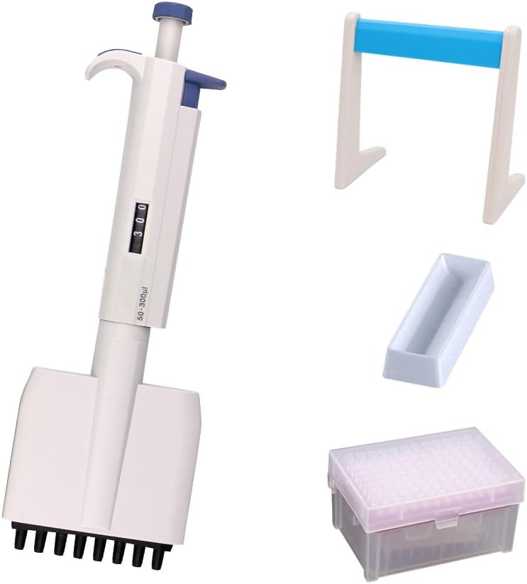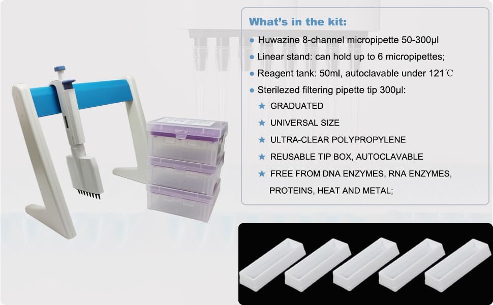 مجموعة ماصات دقيقة 8 قنوات من Huwazine 50-300ul، ماصة قابلة للتعديل × 1، طرف ماصة معقمة مع فلتر 300ul × 288 طرف، حامل ماصة × 1 قطعة، خزان كاشف × 5 قطع (مجموعة ماصة 8 قنوات أ)