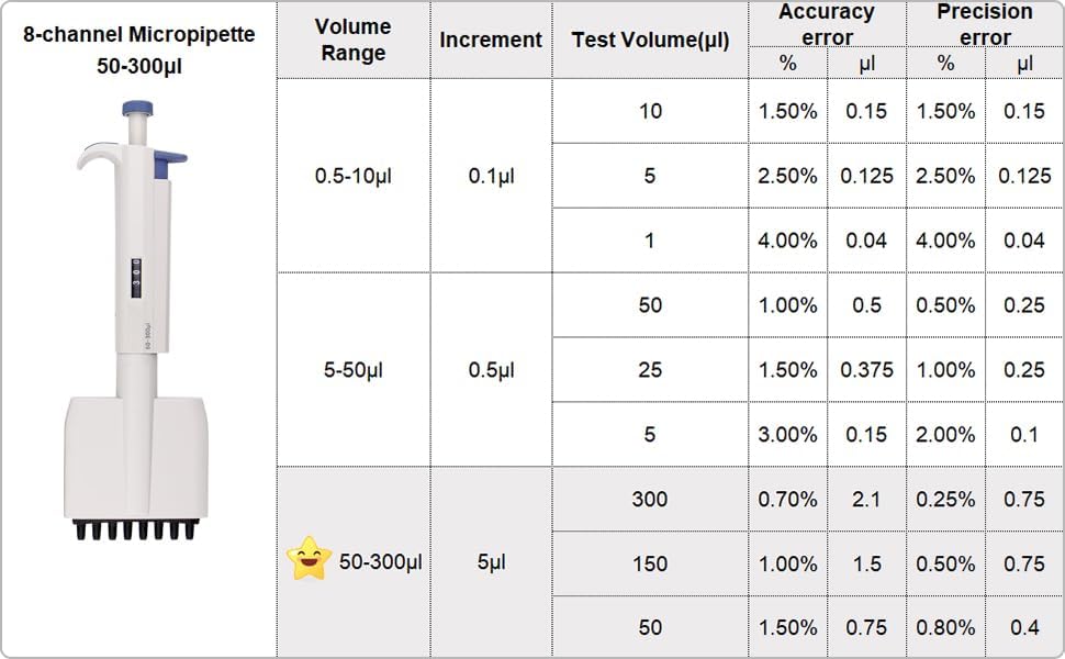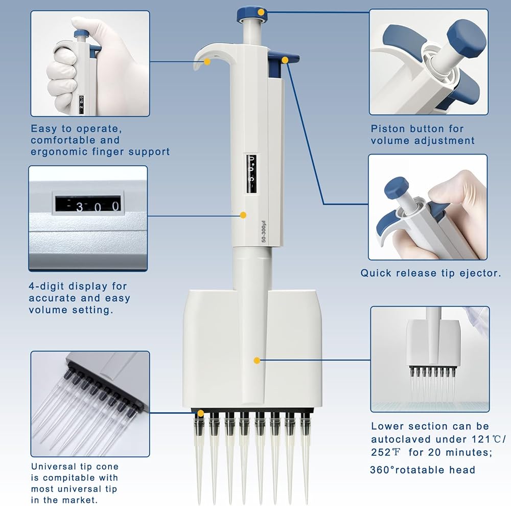 • 50-300 ميكرولتر ماصة مختبرية ذات 8 قنوات، زيادة 5 ميكرولتر. وهي متوفرة للوحة القياسية ذات 96 بئرًا. ● تصميم خفيف الوزن ومريح ومنخفض القوة يساعد على تجنب إصابات الإجهاد المتكررة.