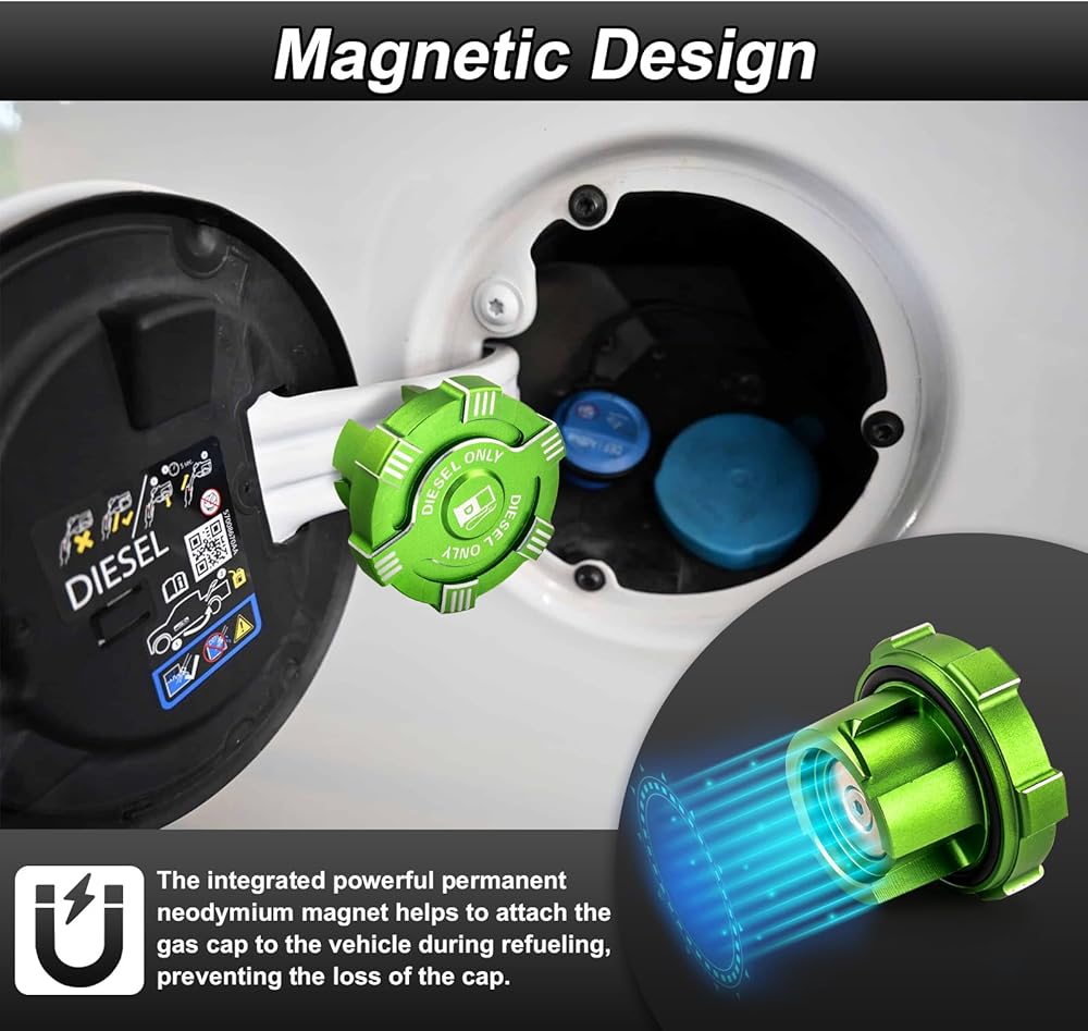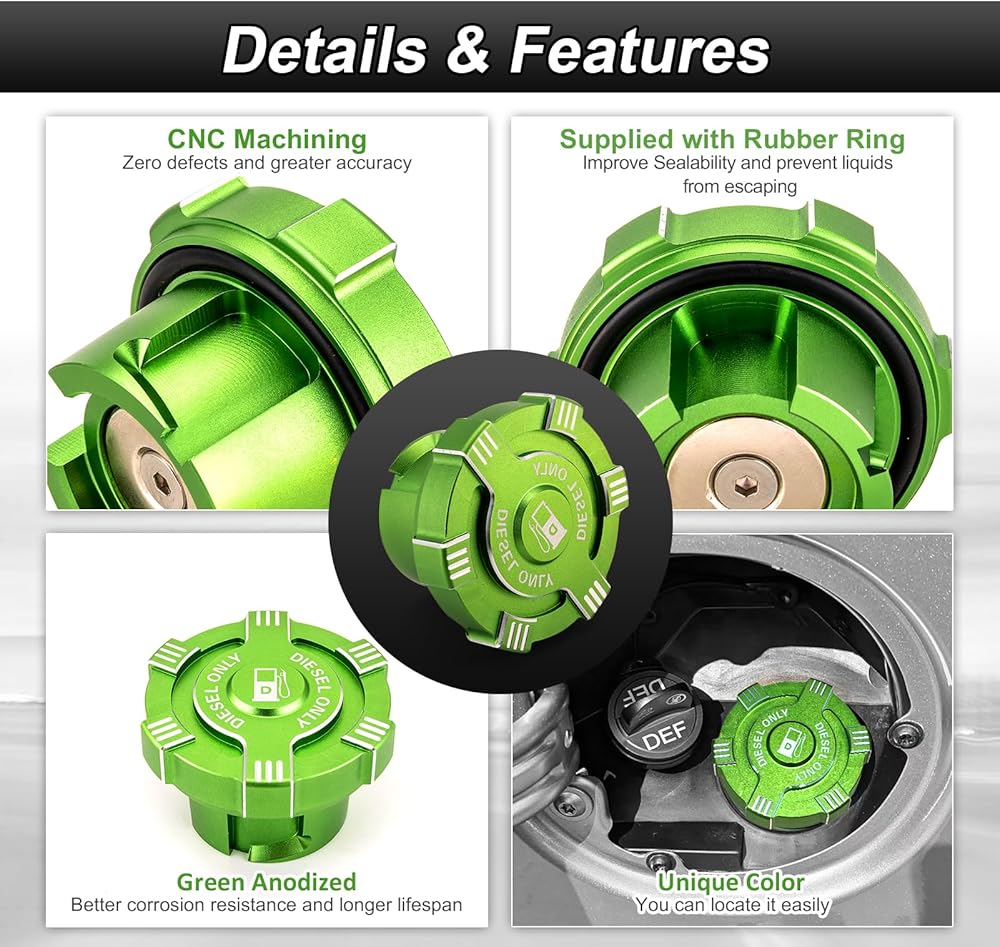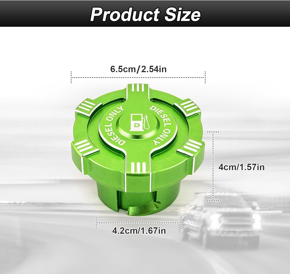 المواد: غطاء وقود الديزل الأخضر المصنوع من الألومنيوم 6061 ليس فقط أخف وزنًا، ولكنه أيضًا أكثر متانة. يوفر اللون الأخضر المؤكسد حماية أكبر، مما يطيل عمر الخدمة ويحافظ على جماليات السيارة