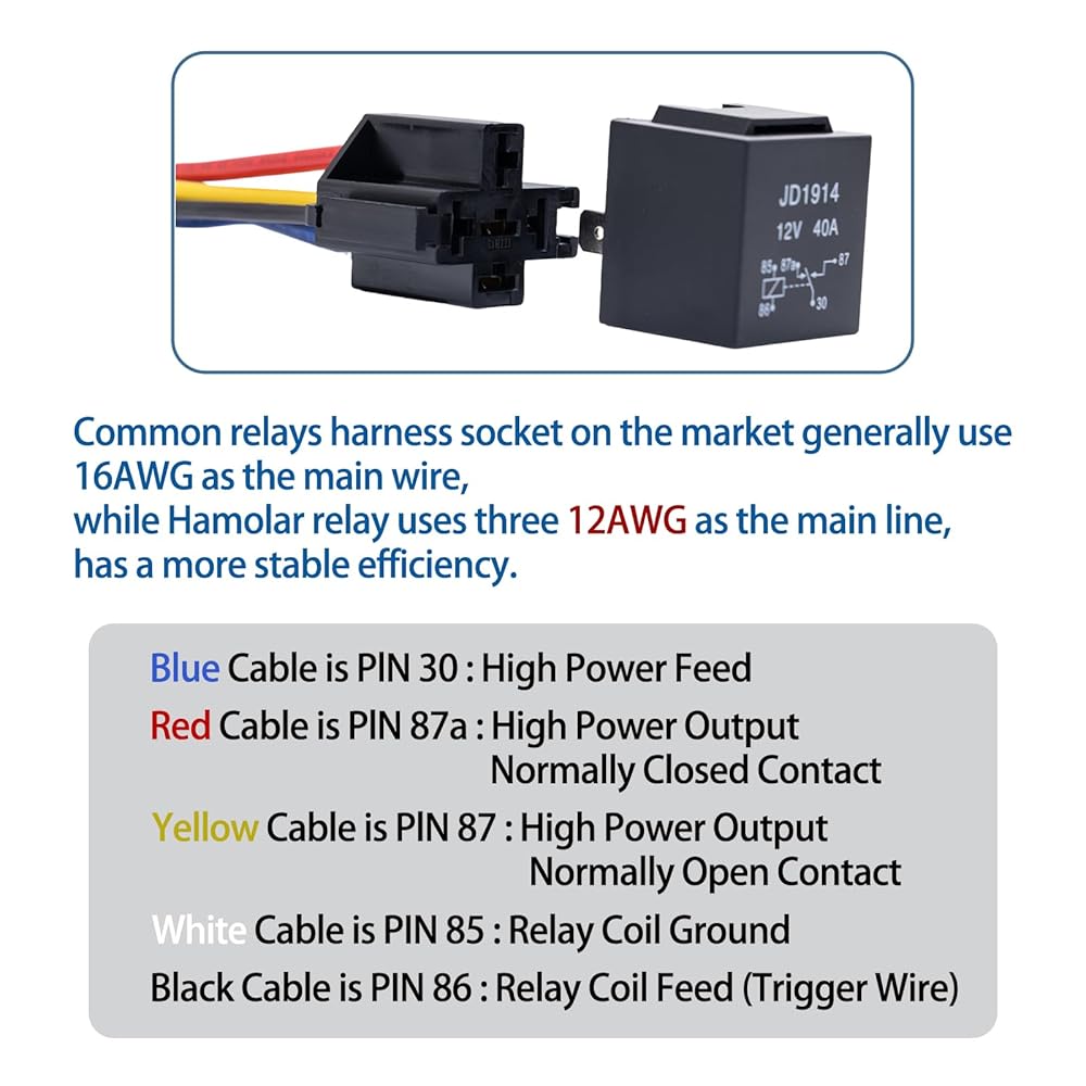 - مواصفات الأسلاك: أبيض - أرضي (85)، أزرق - VDC (30)، أسود - مشغل (86)، أحمر - مخرج N/C (87a)، وأصفر - مخرج N/O (87).