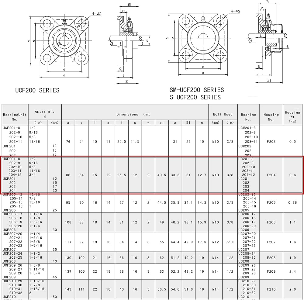UCF205-16 Pillow Block Flange Bearing 1" Bore 4 Bolt Solid Base (4PCS)-Brand New PDT-Bore Size: 1 InchStatic Load Rating: 7.85 kN/1800 lbsDynamic Load Rating: 14 kN/3100 lbsMaterial: Cast IronMax RPM: 3400Quantity Per Order: 4 PiecesSelf Alignment Feature: If the bearing is crooked please don't worry. This is our self-alignment feature. These bearing are meant to have some play in them. When you mount them, just use the shaft to rotate the bearing into proper position, or if it is not out of alignment by much, the bearing will correct its own alignment once it begins to rotate. If the bearings were not aligned properly and spinning at high RPMs then sure disaster would happen. Our self-alignment feature is a way to prevent this from happening. Style: 4 BoltsProduct Description: The UCF pillow block mounted bearing series has four bolt holes, and a set screw lock is designed for mounting onto bearing surfaces parallel to the shaft axis, such as conveyor belts. This ready-to-mount unit has solid base cast iron housing, chrome steel bearings, and is designed for efficient operation at a wide range of speeds. This one-piece pillow block housing allows for a stationary outer ring and rotating inner ring. Insert bearing maintains the separation between moving parts to reduce rotational friction, and to support radial and axial loads. The bearing is secured to the shaft with set screws to prevent slippage. This mounted bearing is used in food and beverage manufacturing, textile industry and many other industrial manufacturing.