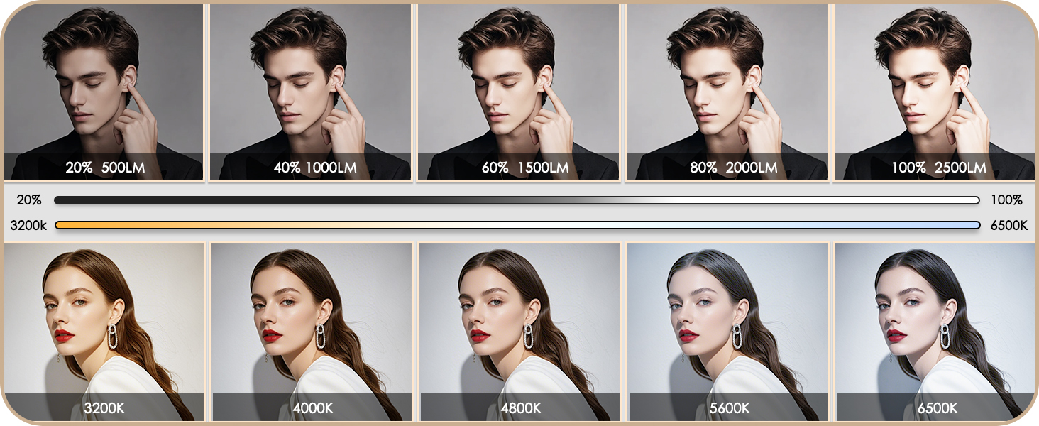 5 ألوان وسطوع متاح - 5 إعدادات ألوان لدرجة الحرارة: 6500K - 5600K - 4800K - 4000K - 3200K؛ 5 إعدادات للسطوع: 100%، 2500 لومن؛ 80%، 2000LM؛ 60%، 1500LM؛ 40%، 1000LM؛ 20%، 500 لومن، من دافئ إلى بارد، ناعم إلى فائق السطوع، مما يساعدك على رؤية كل التفاصيل الصغيرة المفقودة.