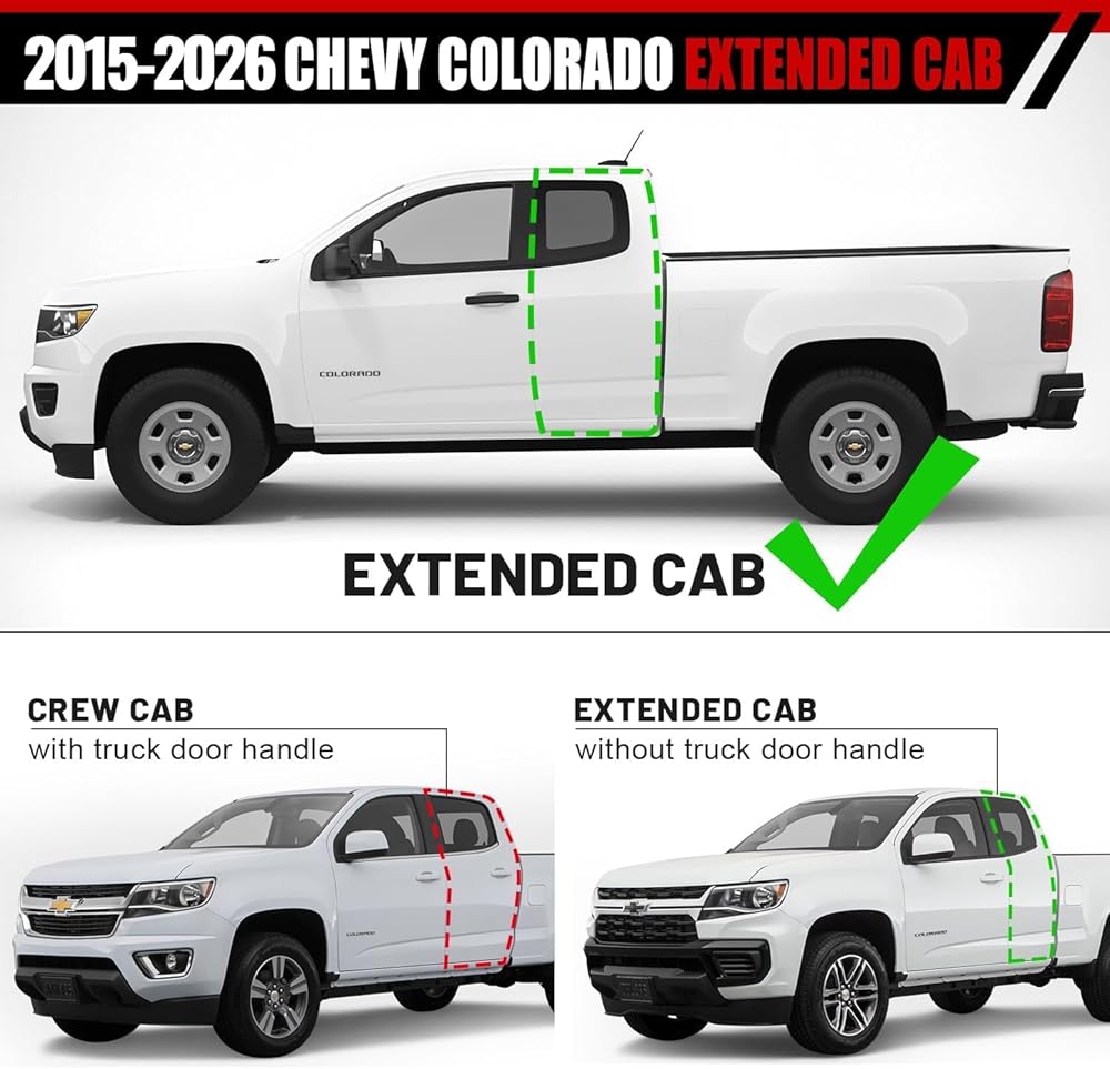 الملاءمة: متوافق فقط مع 2015-2026 Chevy Colorado/Gmc Canyon كابينة مزدوجة ممتدة مع بابين خلفيين بنصف الحجم. غير مخصص لكابينة الطاقم ذات 4 أبواب كاملة الحجم.