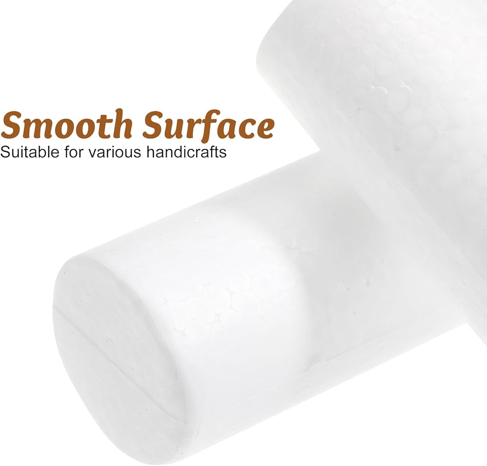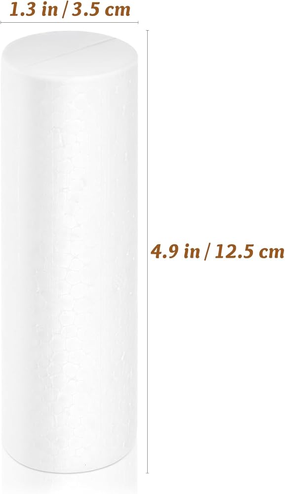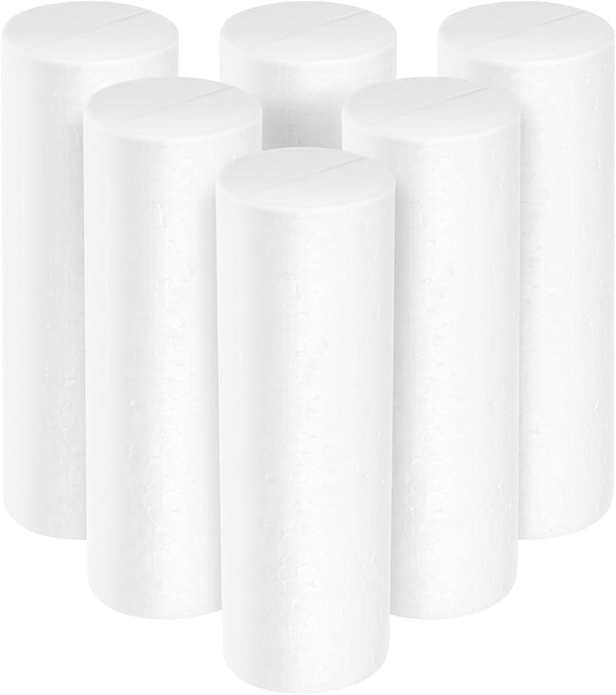 Package Includes: Set of 6 white foam cylinders, each measuring 5 inches tall and 1.3 inches in diameter