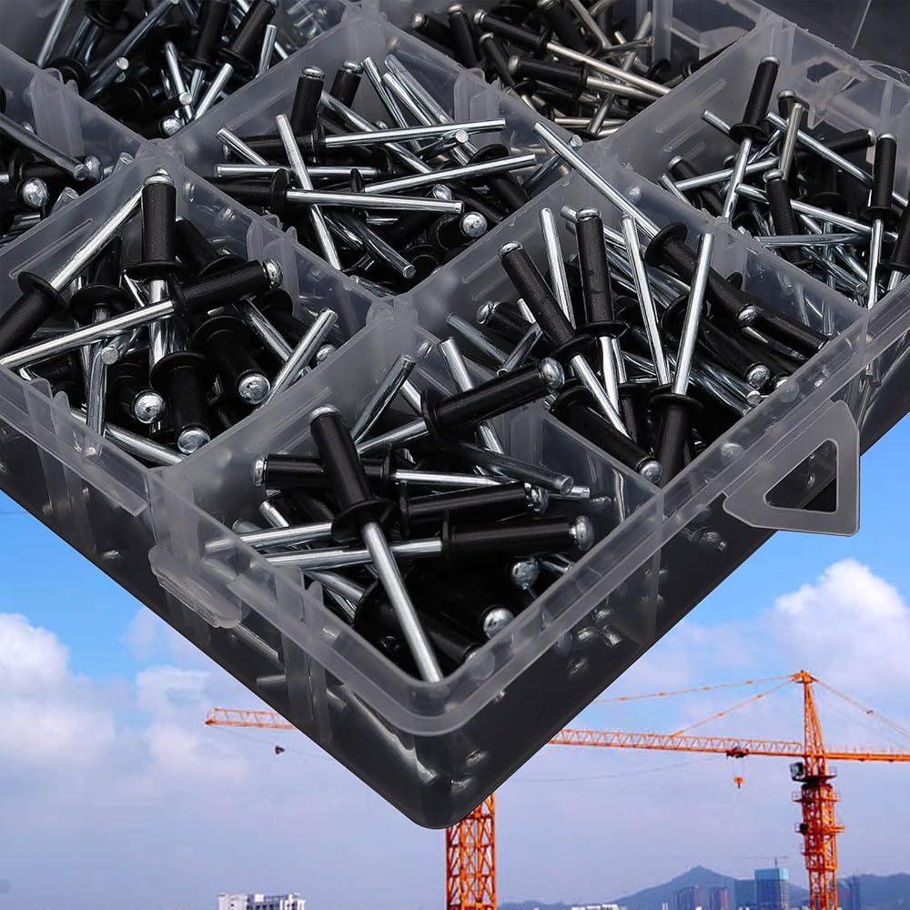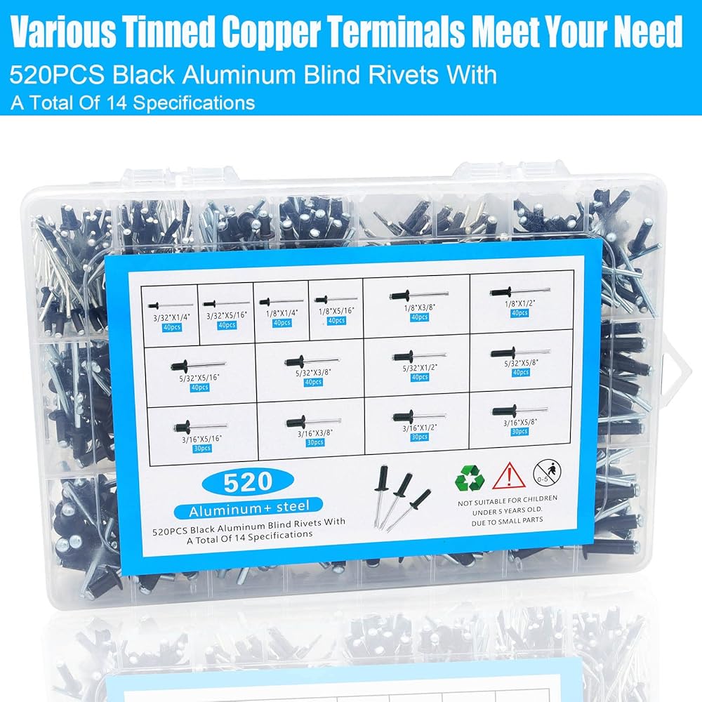مجموعة متنوعة من 520 قطعة من المسامير البوب، 14 مقاسات SAE مجموعة مسامير من الألومنيوم الأسود (3/32 بوصة 1/8 بوصة 5/32 بوصة 3/16 بوصة 1/4 بوصة) مسامير عمياء متنوعة مع مقسم معزز