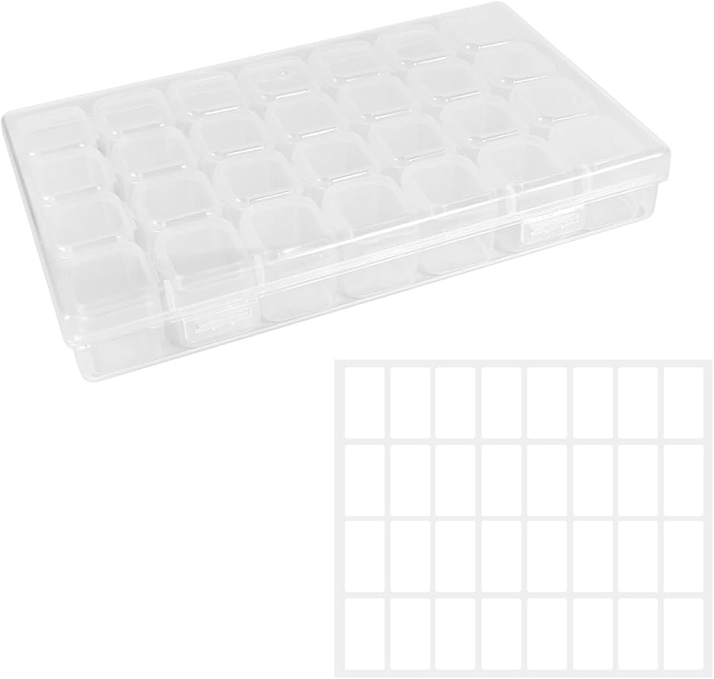 The package includes spacious diamond painting storage containers, each equipped with 28 individual storage boxes featuring lids. Additionally, you get blank label sheets, good for organizing your diamond art accessories and tools