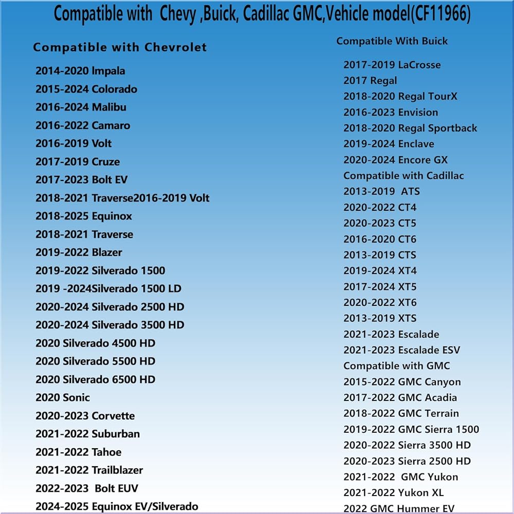 Compatible with Chevrolet Bolt EUV 2022-2023,Bolt EV 2017-2023 Blazer 2019-2022, Camaro 2016-2024,Colorado 2015-2024,Malibu 2016-2024,Equinox 2018-2025,Equinox EV/Silverado EV2024-2025, Silverado 1500 LTD2019-2022,Silverado 1500 2019-2024,Silverado 2500 HD 2020-2024,Silverado 3500 HD 2020-2024,Corvette 2020-2023,Cruze 2016-2019, Impala 2014-2020,Traverse 2018-2025, Traverse Limited 2024,Trax 2024-2025,Volt 2016-2019 Compatible with Buick Enclave 2019-2024,Encore GX 2020-2024,Envision 2016-2023,LaCrosse 2017-2019 ,Regal Sportback 2018-2020,Regal 2017,Regal TourX 2018-2020; Compatible with Cadillac ATS 2013-2019, CT4 2020-2022,CT5 2020-2023,CT6 2016-2020,CTS 2013-2019,XT4 2019-2024, XT5 2017-2024, XT6 2020-2022, XTS 2013-2019,Escalade 2021-2023, Escalade ESV 2021-2023 Compatible with GMC Acadia 2017-2022, GMC Canyon 2015-2022 ,GMC Hummer EV 2022 , GMC Sierra 1500 2019-2022 , Sierra 2500 HD 2020-2023, Sierra 3500 HD 2020-2022, GMC Terrain 2018-2022,GMC Yukon 2021-2022 ,GMC Yukon XL 2021-2022