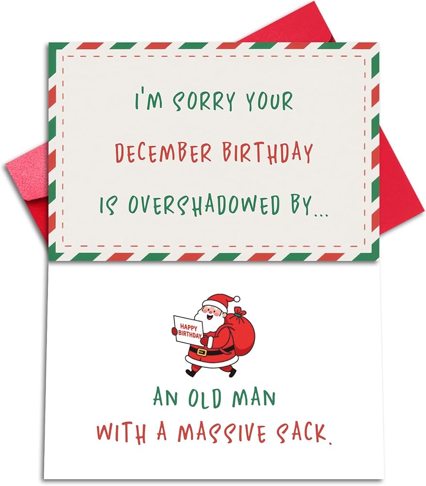مرحة وذكية: هذه البطاقة المضحكة ذات الوجهين مخصصة لأي شخص لديه عيد ميلاد في شهر ديسمبر. نحن نعلم أن يومك الخاص يضيع دائمًا في خلط ورق اللعب لأن شخصًا ما يرتدي بدلة حمراء يسرق كل الاهتمام