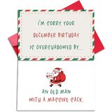 بطاقة عيد ميلاد مضحكة على الوجهين لشهر ديسمبر لعائلة الأصدقاء، بطاقة هدية عيد ميلاد سعيد لها (أنا آسف لأن عيد ميلادك في شهر ديسمبر قد طغى عليه رجل عجوز يحمل كيسًا ضخمًا)