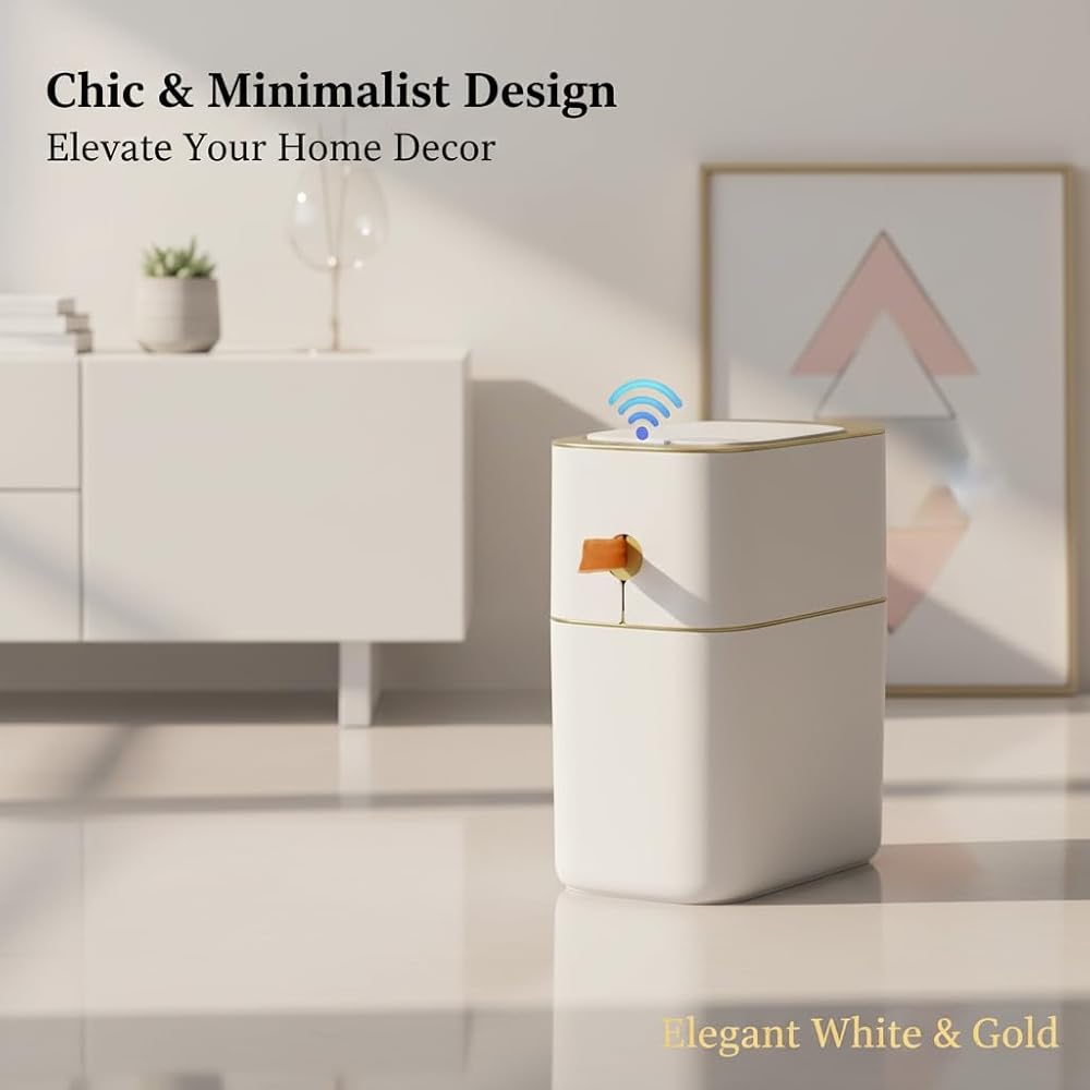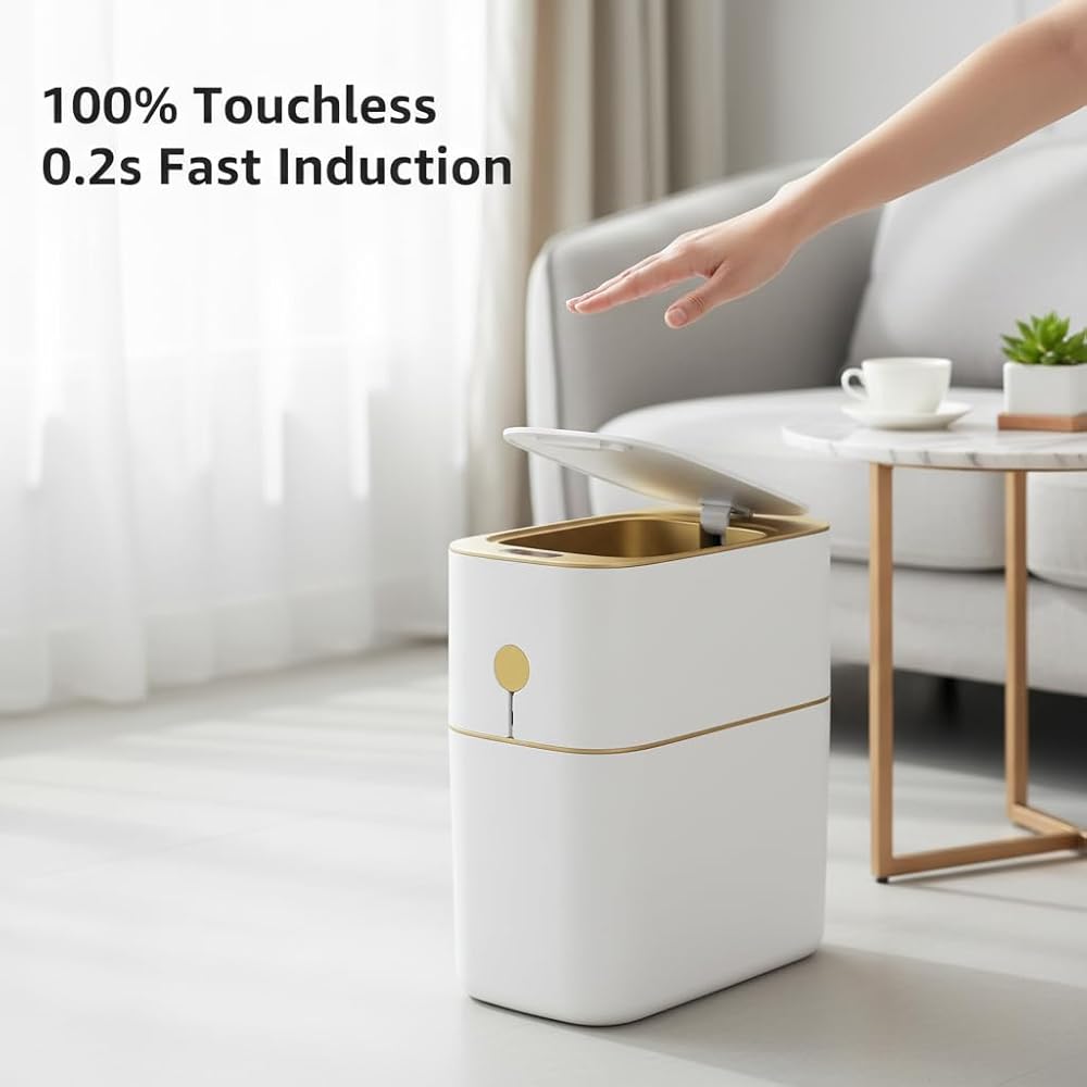 سلة الحمام التلقائي في Mopall مع غطاء ، 3.1 جالون / 13L من مستشعر الحركة الذكية سلة نفايات صغيرة بلا لمس ، وعلب القمامة البلاستيكية النحيفة لالتكافح مكتب غرفة النوم ، المرحاض البيت الأبيض والذهبي