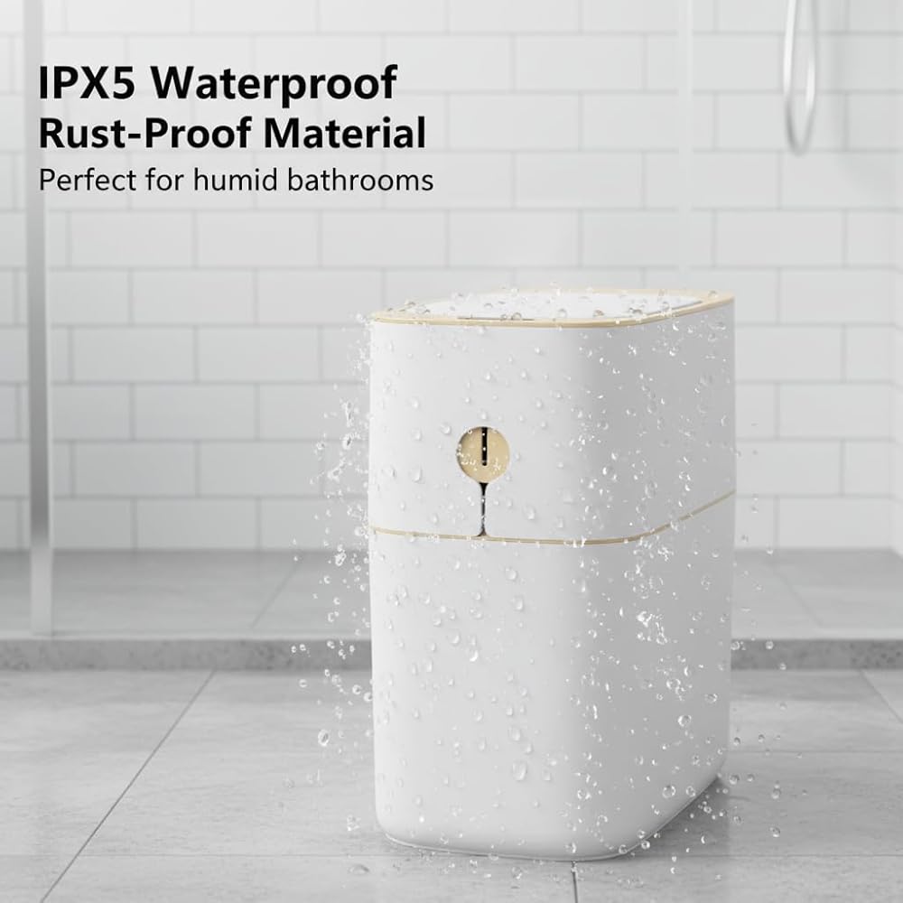 IPX5 WATERPROOF TECHNOLOGY - Can safe using in the wet environments, RV/restroom/bedroom/office/kitchen trash can. ABS+PP materials, smooth surface white trash can design, dirt are not easy to stay and easy clean.