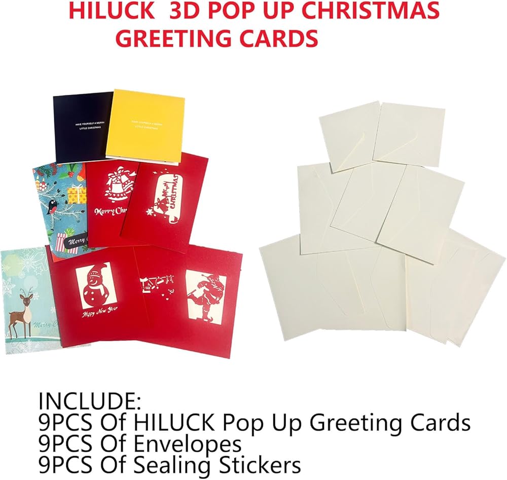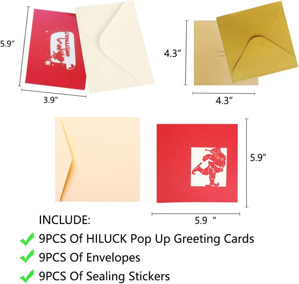 بطاقات معايدة عيد الميلاد ثلاثية الأبعاد، 9 قطع، بطاقات مصنوعة يدويًا منبثقة مع مغلف، مجموعة مكونة من 9 قطع، لعطلة الشتاء في رأس السنة الجديدة - تتميز بشجرة عيد الميلاد ورجل الثلج والرنة وسانتا والجرس