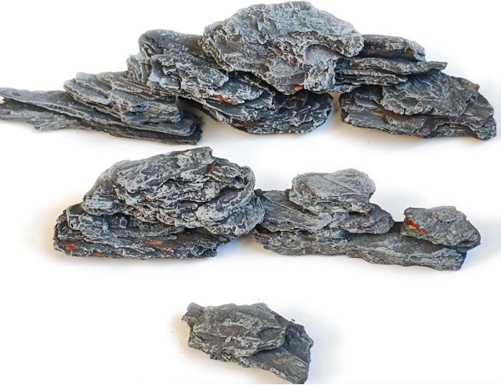 Transform your miniature landscapes into stunning works of art with these expertly crafted artificial slate rocks. Each piece features incredibly realistic texturing and weathering patterns that perfectly mimic natural slate, complete with moss-like accents that add a touch of lush greenery. These lightweight wooden pieces are ideal for creating depth and visual interest in terrariums, miniature gardens, model railway scenery, and diorama landscapes. The varied sizes and natural-looking formations allow for versatile arrangement possibilities, whether creating rock walls, cliff faces, or scattered stone features. The durable construction ensures these decorative elements maintain their appearance over time, while the detailed craftsmanship captures the organic beauty of moss-covered stone. Perfect for hobbyists and miniature enthusiasts looking to add authentic-looking geological elements to their creative projects. The weathered gray coloring and textured surfaces provide a realistic foundation for any miniature landscape design.
