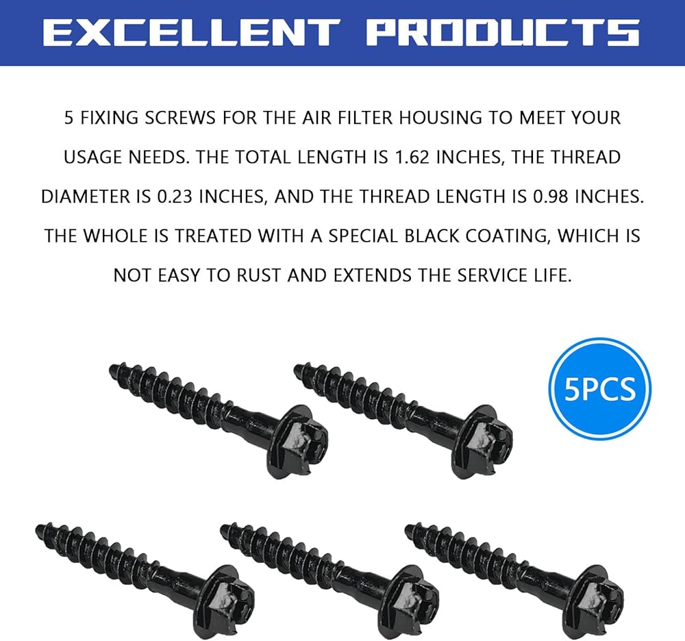 • Professional Kit Configuration: Our air box bolt screws contains 5 bolts with special anti-rust treatment, with specifications of 1.62 inches in length, 0.23 inches in thread diameter, and 0.98 inches in thread length
