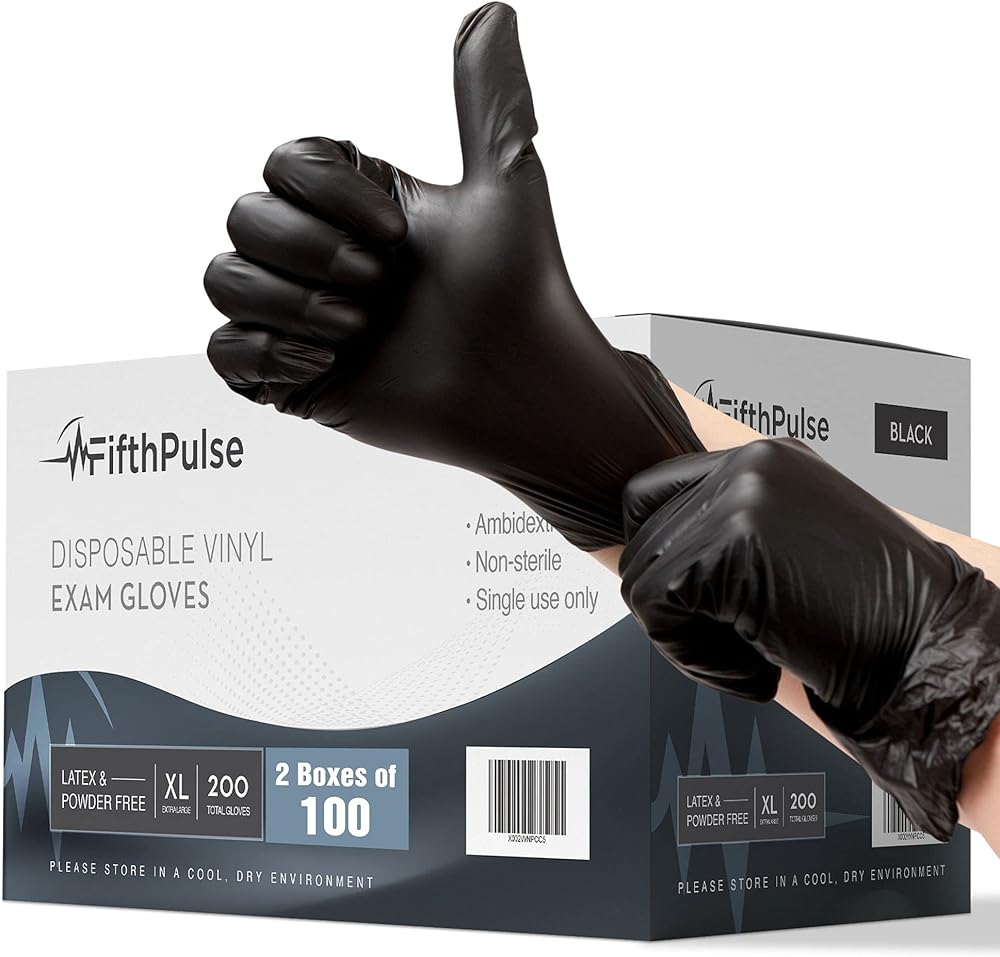 قفازات سوداء صغيرة من الفينيل للاستعمال مرة واحدة، 200 قطعة - خالية من اللاتكس، قفازات طبية خالية من البودرة - جراحة، منزلية، التنظيف، قفازات طعام - سمك 3 ميليلتر - صندوقان من 100 قطعة