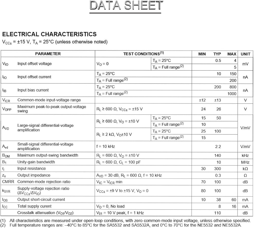 إن NE5532 عبارة عن مكبرات صوت تشغيلية عالية الأداء تجمع بين خصائص التيار المستمر والتيار المتردد الممتازة. إنها تتميز بضوضاء منخفضة جدًا، وقدرة عالية على محرك الإخراج، وكسب وحدة عالي وأقصى نطاق ترددي لتأرجح الإخراج، وتشويه منخفض، ومعدل دوران مرتفع، وثنائيات حماية المدخلات، وحماية دائرة قصر الإخراج. يتم تعويض مكبرات الصوت التشغيلية داخليًا عن عملية كسب الوحدة. حددت هذه الأجهزة حدودًا قصوى لجهد ضوضاء الإدخال المكافئ.