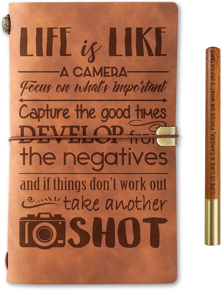 Photographer Gifts Journal for Women, Men, Photography Gifts for Photographers, Faux Leather Embossed Refillable Notebook, 7x5 Inches - Camera - With Pen