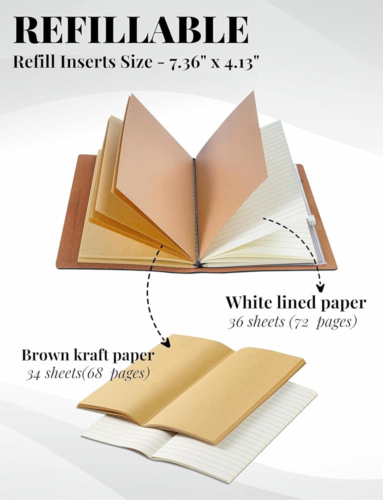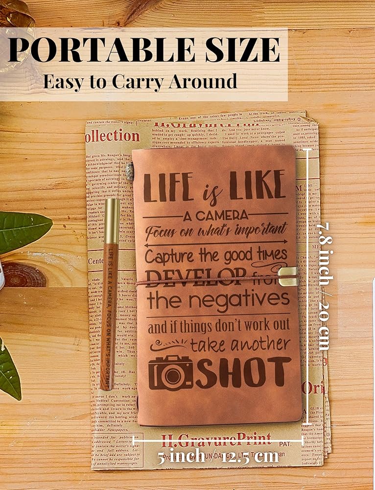 • Perfect size - 7.8" * 5" (20 cm * 12.5 cm) and has 70 pages (140 pages), perfect for carrying and writing. It can be easily put into a pocket, backpack, or purse, and travel anytime, anywhere. This travel journal is also very suitable for use as bullet journals, daily planners, logbooks, food planners, artist sketchbooks, drawing, sketching, paintings, etc.