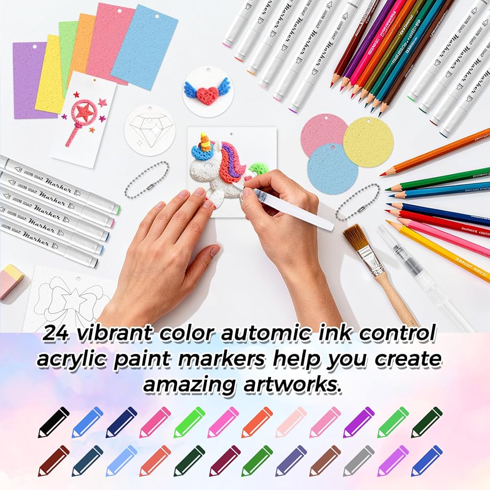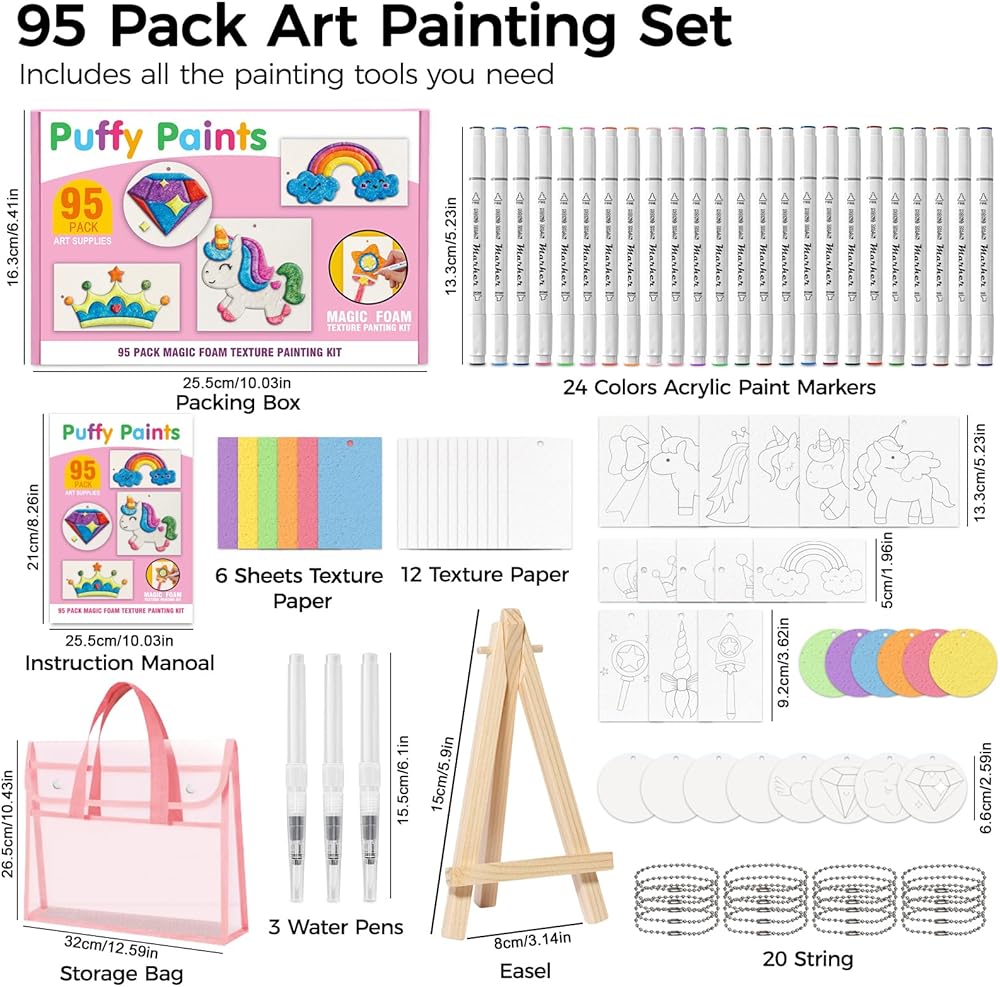 مجموعة طلاء الملمس الإسفنجي السحري: تحتوي هذه المجموعة الشاملة على 45 ورقة من الورق السحري المنتفخ (مع 20 سلسلة خرز)، و24 قلم طلاء أكريليك في صندوق أكريليك شفاف، و3 فرش مياه، وحامل صغير، ومجموعة من تعليمات التشغيل، وحقيبة تخزين شفافة. مثالي للأطفال والكبار، فهو مصمم لإلهام الإبداع والمساعدة في إنشاء أعمال فنية ثلاثية الأبعاد فريدة من نوعها