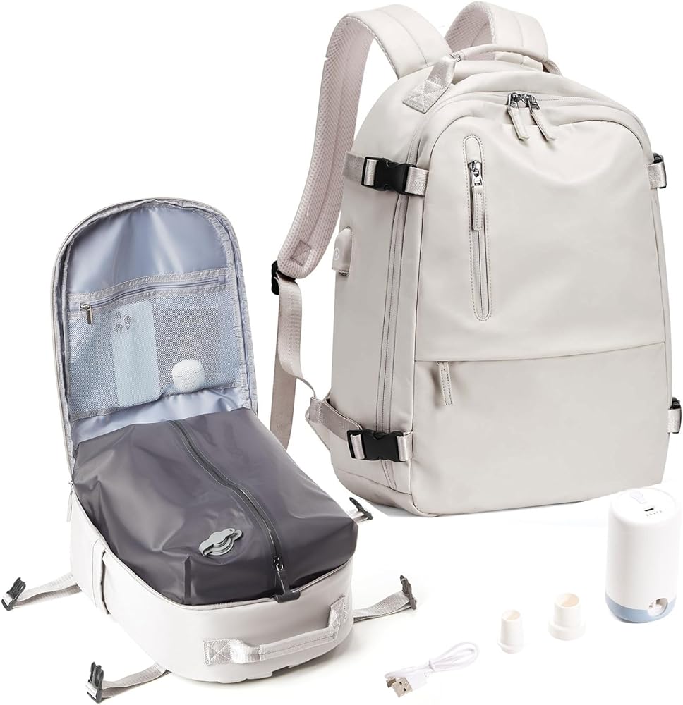 حقيبة ظهر للسفر من SEAFEW مع ضغط ختم فراغ، حقيبة ظهر مقاومة للماء لحقيبة الأغراض الشخصية المعتمدة للطيران مع مضخة، حقيبة ظهر للكمبيوتر المحمول للأعمال مع شحن USB للمشي لمسافات طويلة في صالة الألعاب الرياضية، بيج