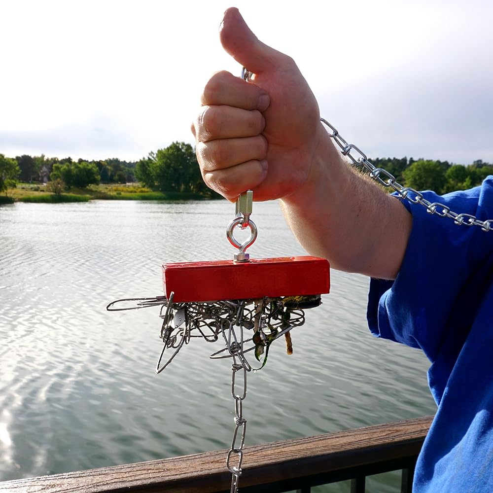 مغناطيس الصيد: يمكن استخدام مغناطيس استرجاع ماستر ماجنتكس القوي لاكتشاف الأدوات المفقودة والكنوز والمفاتيح والأجسام المعدنية الأخرى من أعماق البحيرات والبرك وغيرها من أجسام الماء. مسمار للعين قابل للإزالة يتيح الصيد المغناطيسي المثالي