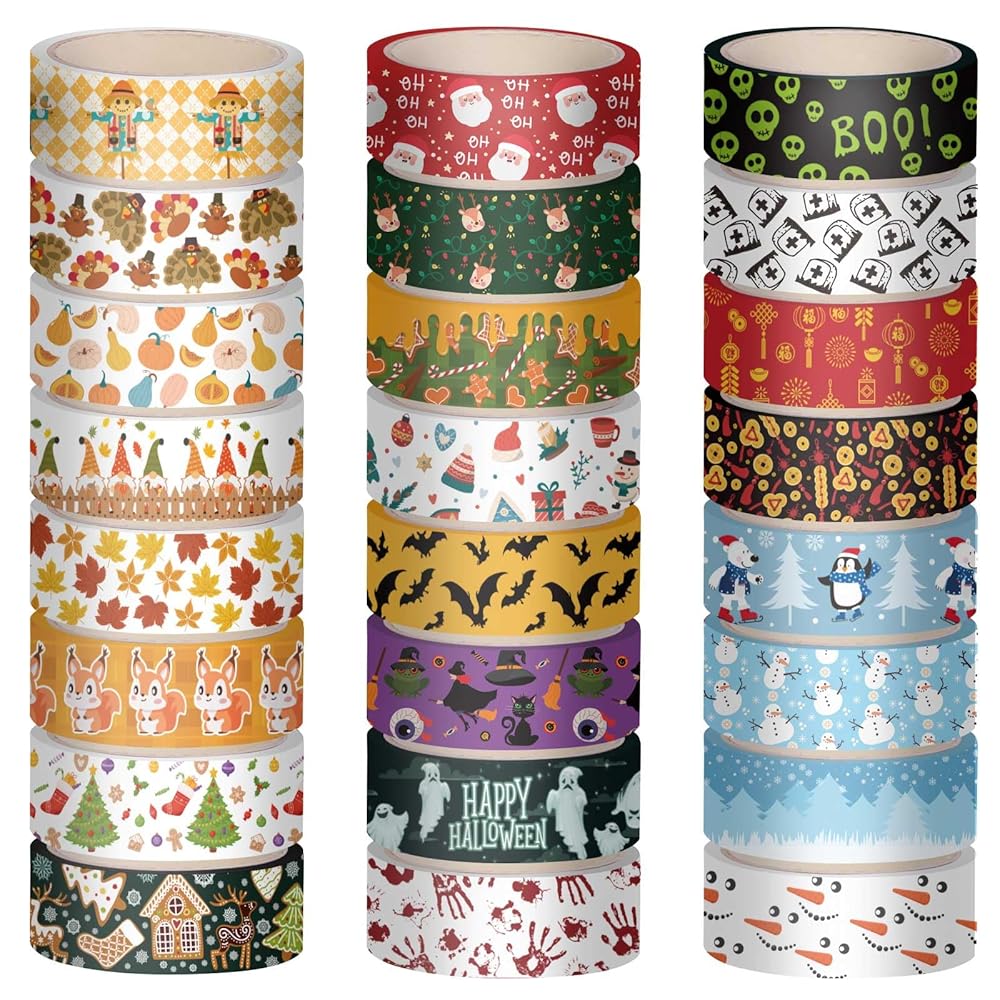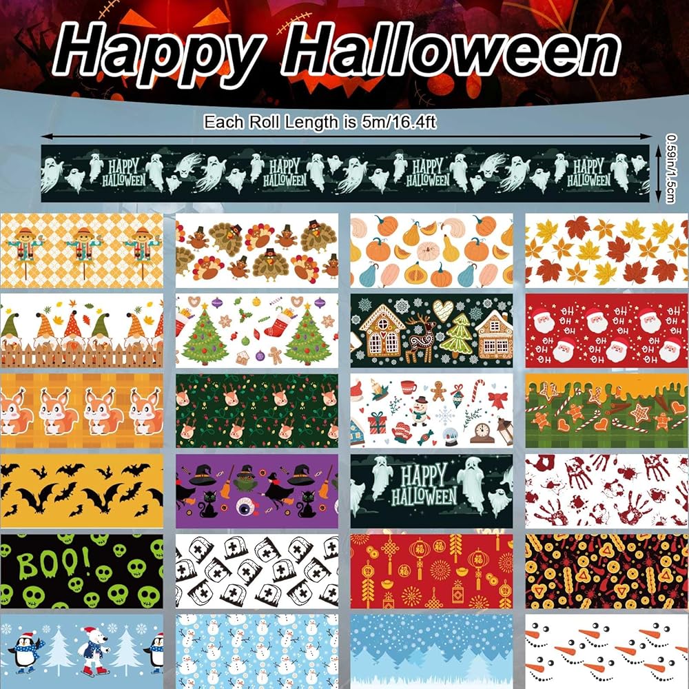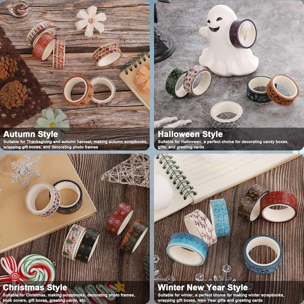 Product Included: You will receive 24 pieces of holiday tapes in a pack, including 6 pieces of halloween tapes, 6 pieces of autumn tapes, 6 pieces of christmas tapes and 6 pieces of winter new year tapes.