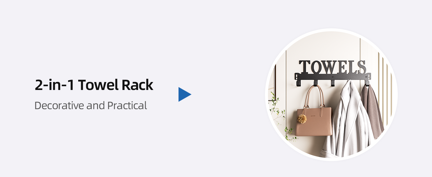 • تطبيق متعدد الاستخدامات: يتكيف بشكل مثالي مع المساحات المختلفة، بما في ذلك غرفة المعيشة وغرفة النوم والخزانة والحمام والمطبخ وحمام السباحة والمركبات الترفيهية. يعتبر رف المناشف هذا مثاليًا لتعليق المناشف والمعاطف وأردية الحمام والحقائب والمظلات وأدوات المطبخ.