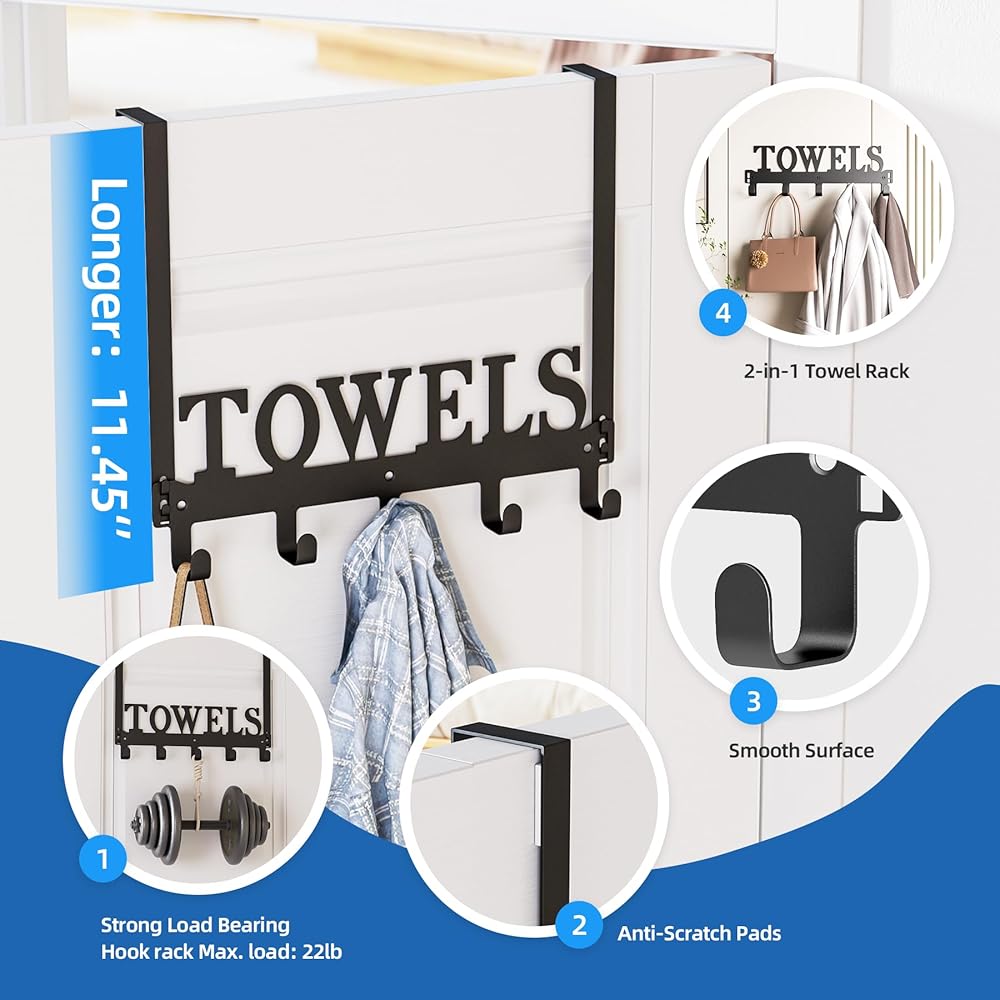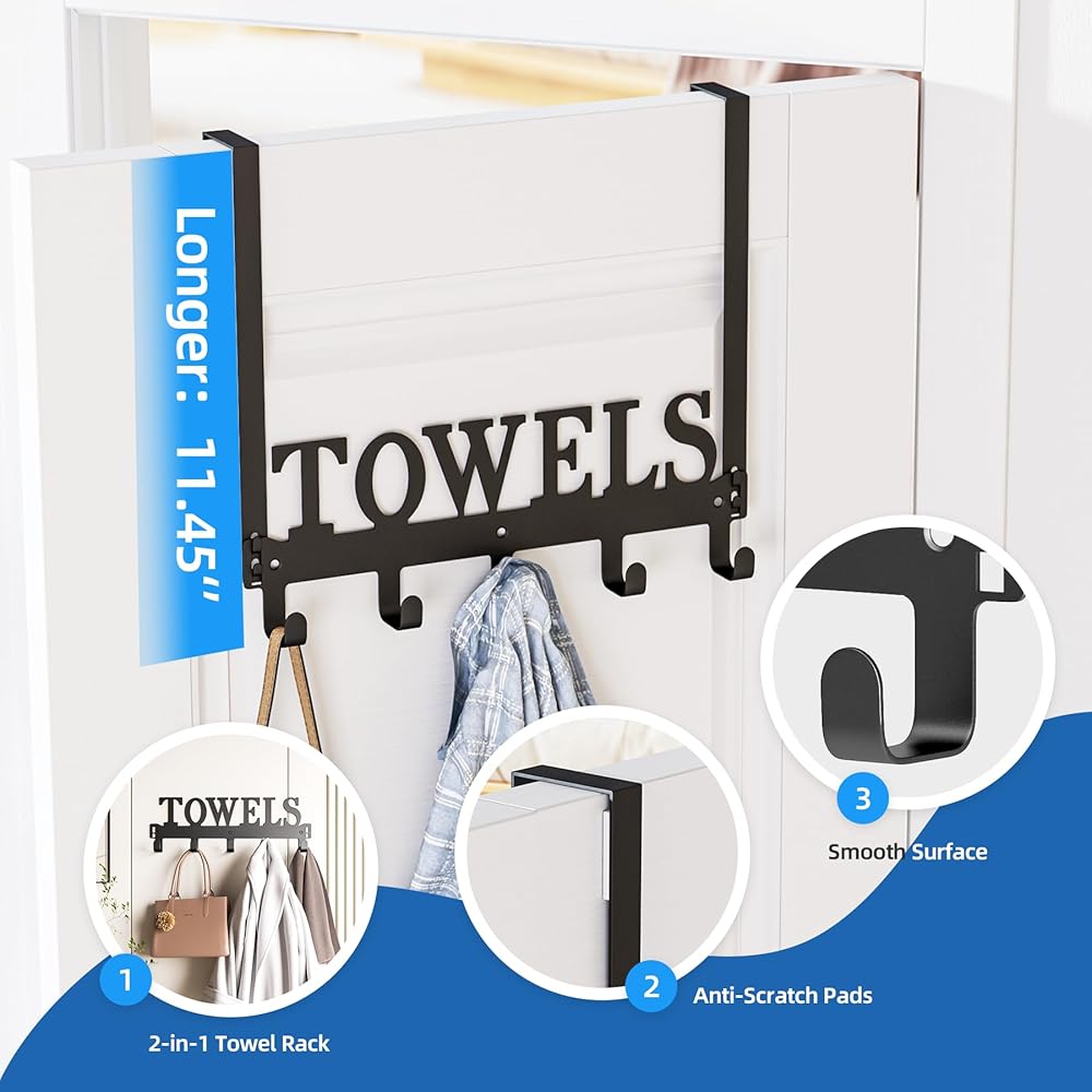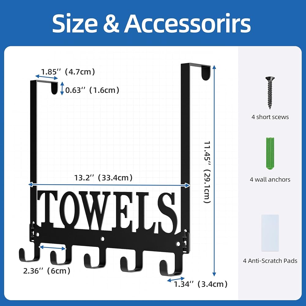 • وسادات حماية عالية الجودة: رف خطاف المنشفة مصنوع من معدن متين. يأتي مع 4 وسادات واقية يمكنها حماية الباب إلى حد معين. تم صقل سطح رف المناشف المعدني بالرمل ولا يؤذي يديك.