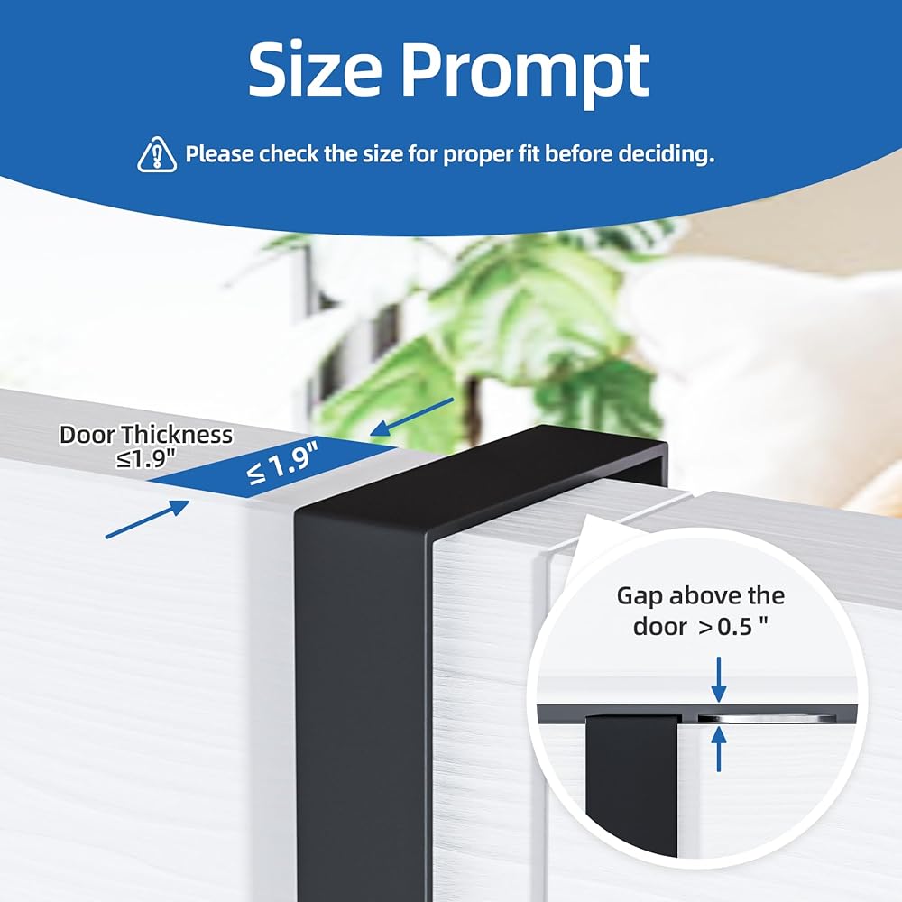 • حجم الباب: يناسب الأبواب التي يصل سمكها إلى 1.9 بوصة. قبل الشراء، قم بقياس سمك الباب الخاص بك للتأكد من أنه ضمن حد 1.9 بوصة وتأكد من وجود مساحة 0.5 بوصة على الأقل فوق الباب لتثبيت الخطاف بأمان.