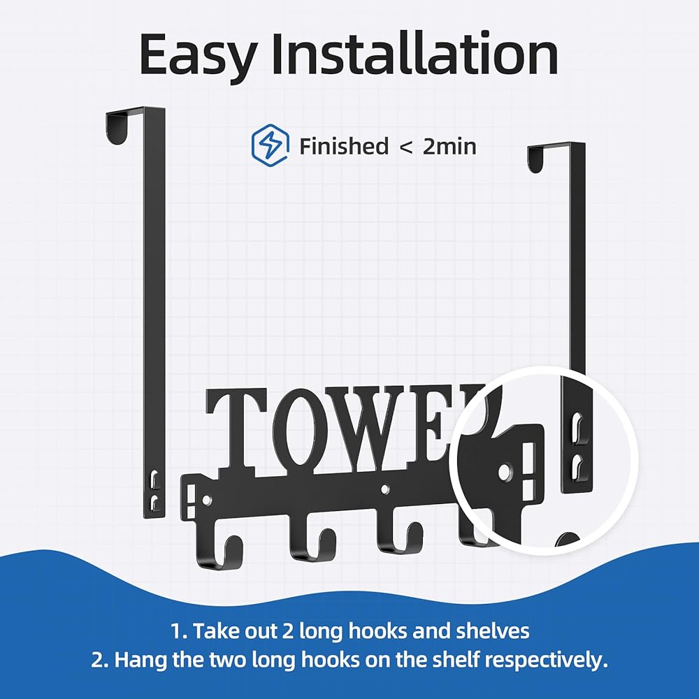 • سهولة التركيب: يعد تركيب رف المناشف فوق الباب أمرًا سهلاً، ويستغرق أقل من دقيقتين لإكماله. نصائح التثبيت: 1. أخرج خطافين ورفوفًا طويلتين. 2. قم بتعليق الخطافين الطويلين على الرف على التوالي.