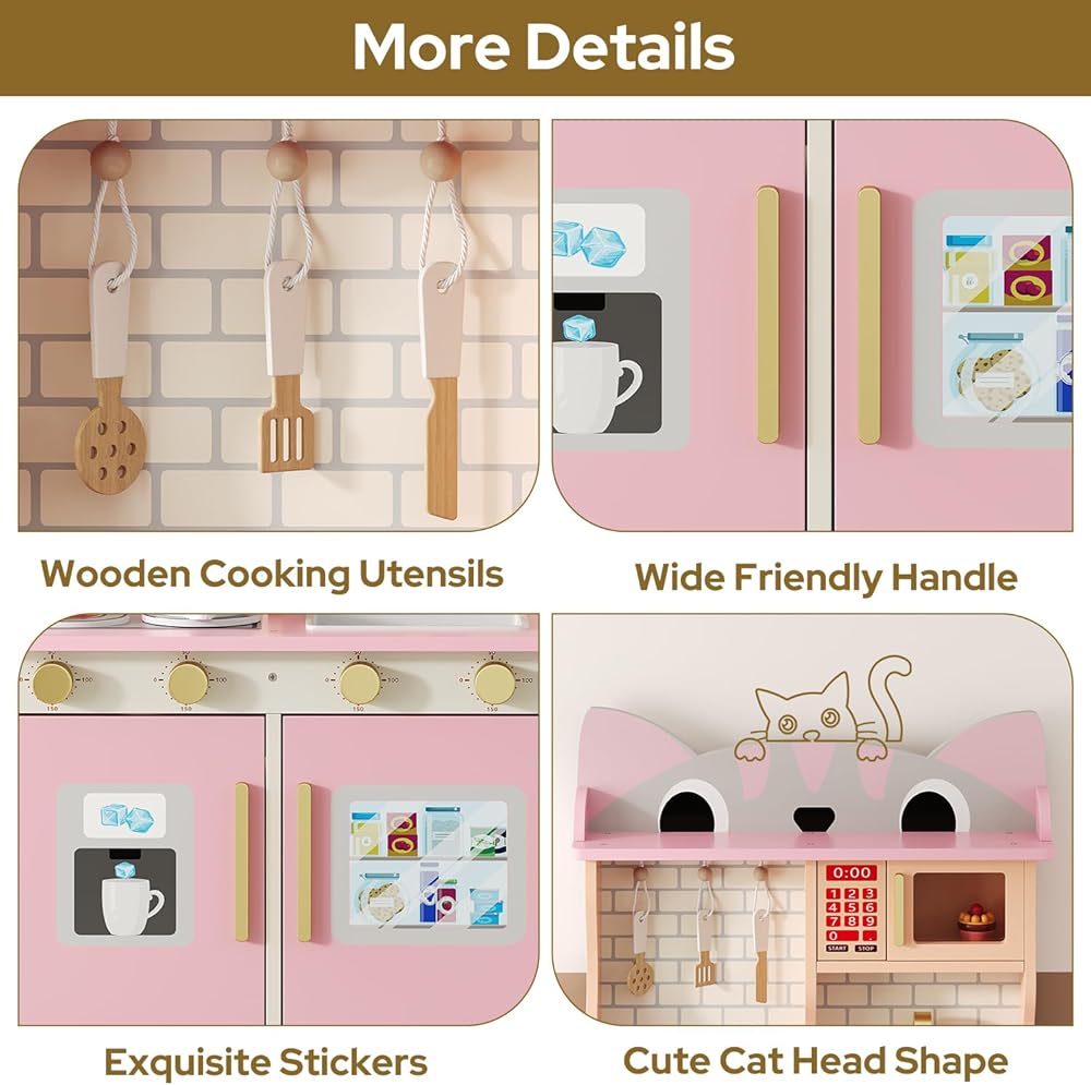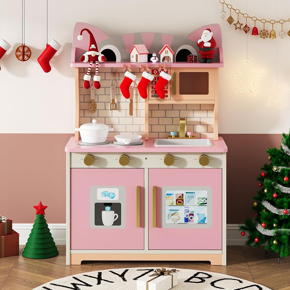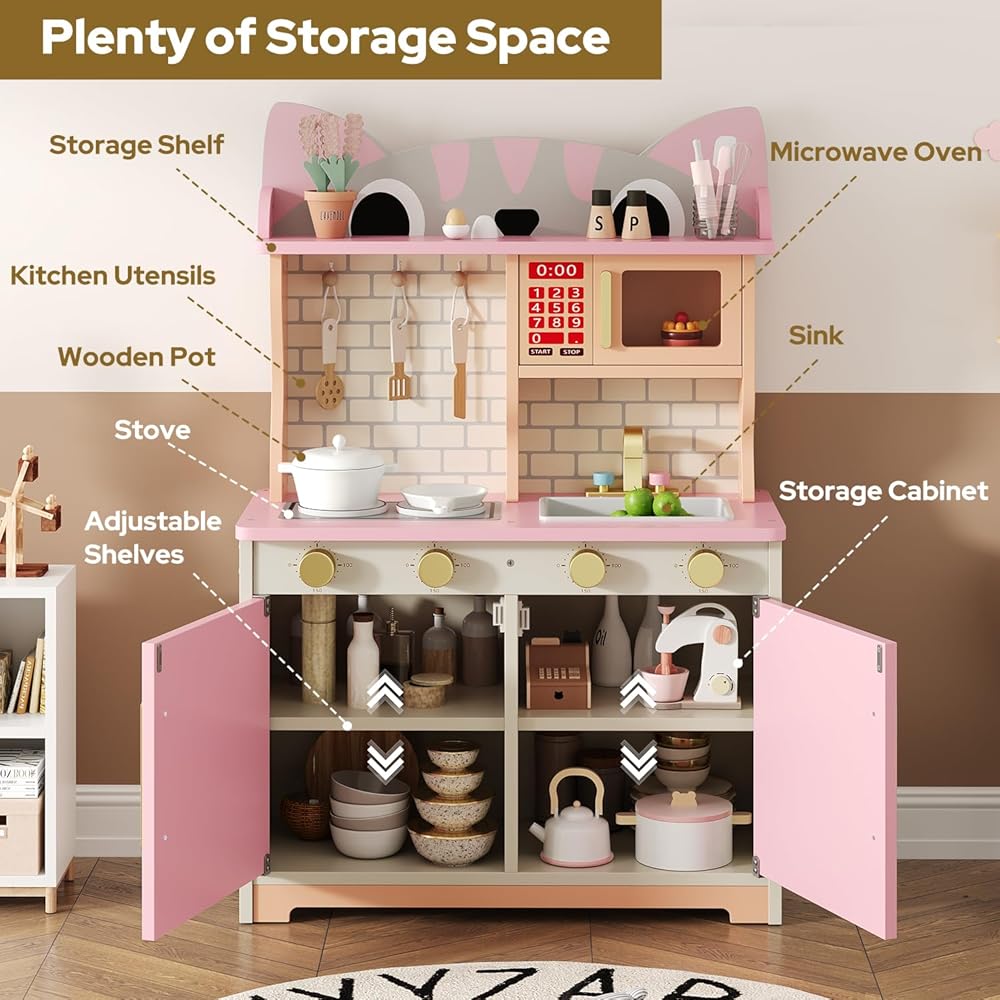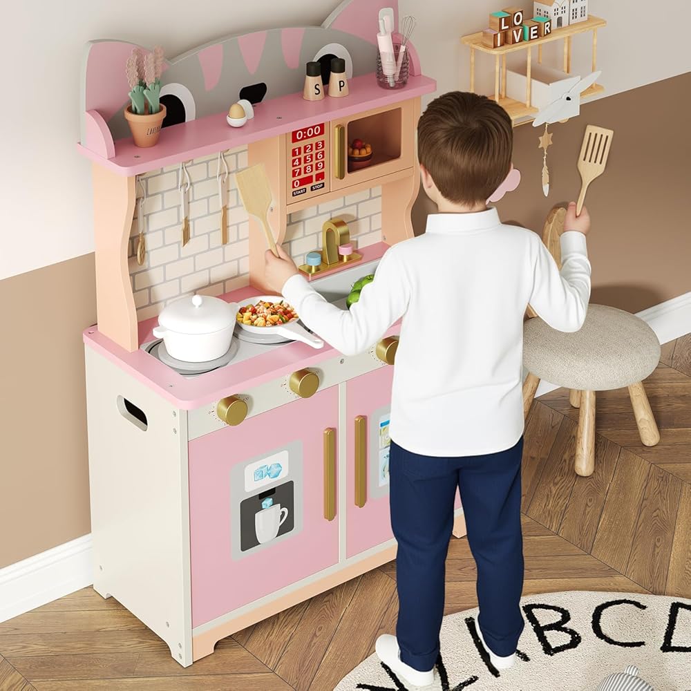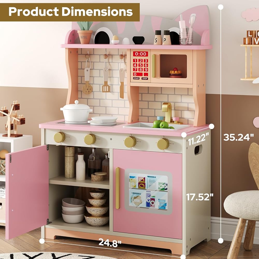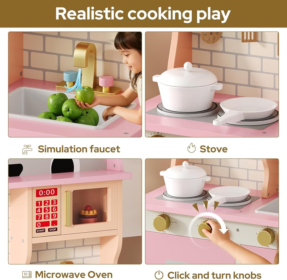 مجموعة لعب المطبخ الخشبية متعددة الوظائف: سيحب الطهاة الصغار مجموعة لعب المطبخ الشاملة هذه، والتي تتضمن حوض مياه، وصنبور محاكاة، وميكروويف، وموقد، وأدوات الطبخ ومساحة تخزين، إلخ. وحدات متعددة تدعم اللعب التظاهري طويل الأمد وتساعد على تطوير المهارات الحركية الدقيقة لكل من الأولاد والبنات.