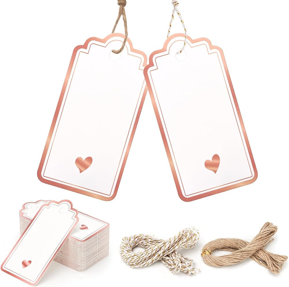 Package Includes:You will receive 100 rose gold gift tags with string, measuring 1.8×3.5 inches (4.5×9 cm). Each gift tag set also includes 10m of jute rope and 10m of gold-thread white rope, providing ample material for multiple gift-wrapping needs. This elegant paper tags with strings combines beautifully designed hearts with practical dual-colored cords, making it perfect for wedding invitations, boutique packaging, and other special occasions