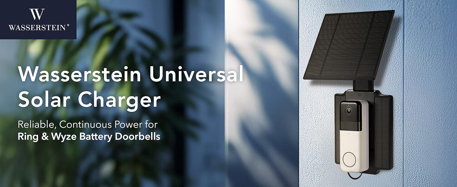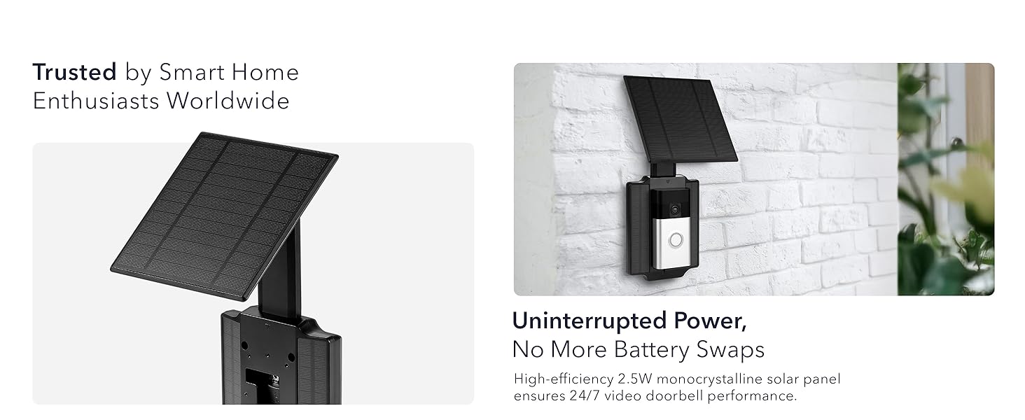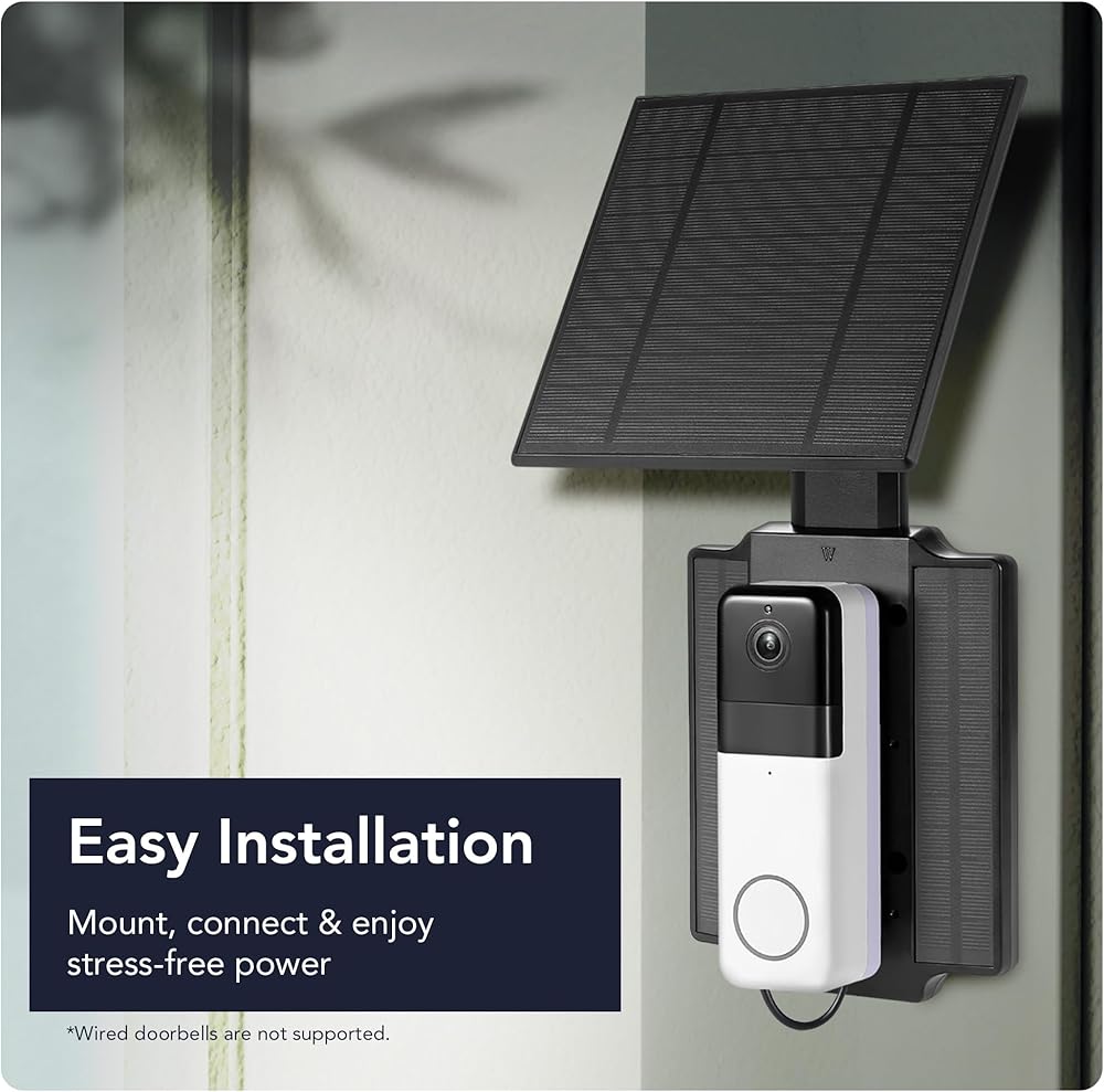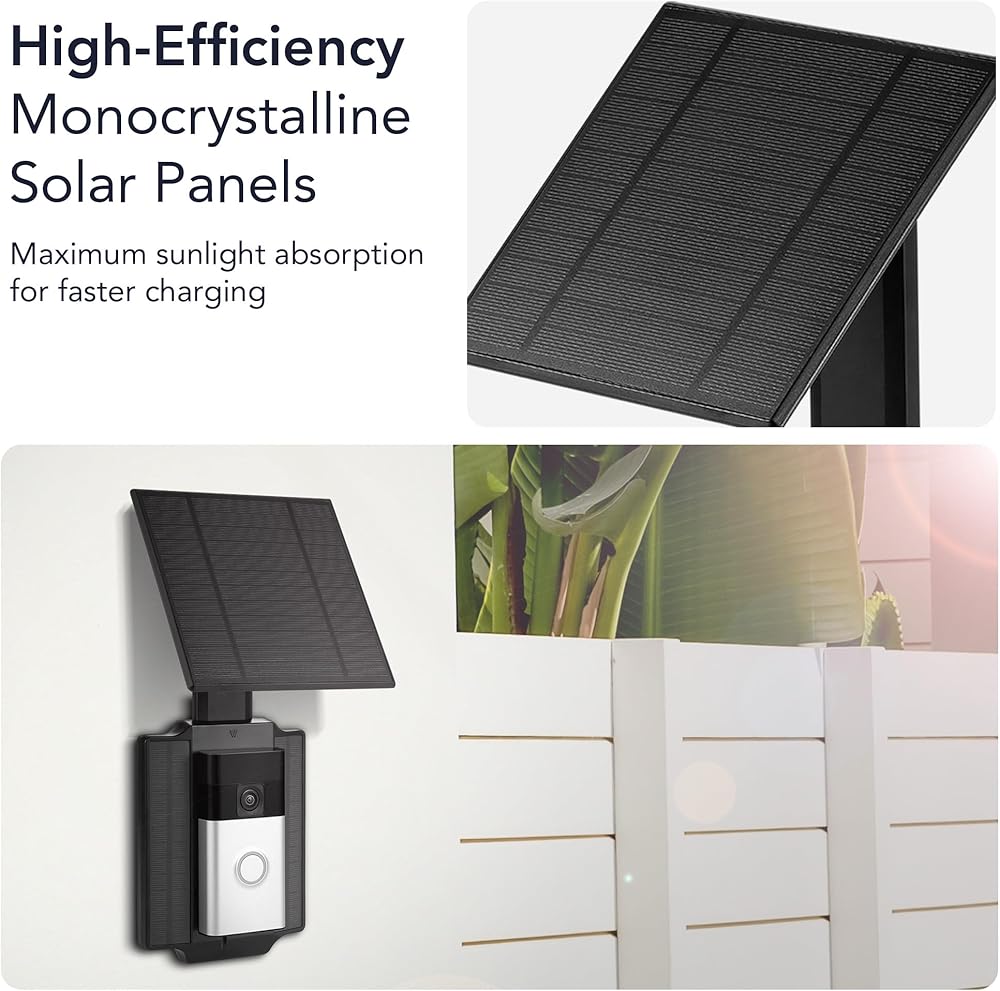 شاحن طاقة شمسية عالمي من Wasserstein متوافق مع جرس باب البطارية الدائري (إصدار 2024)/Pro/Plus/4/3/3 Plus/الجيل الثاني (إصدار 2020) وجرس باب فيديو لاسلكي من Wyze Pro - شاحن لوحة شمسية 2.5 وات