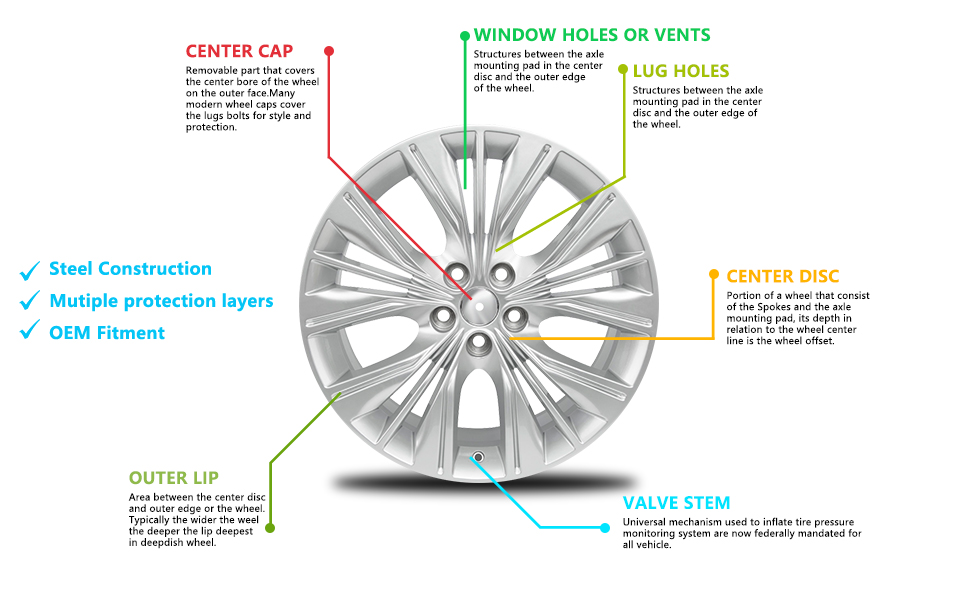 ما هو متضمن - السعر لعجلة واحدة فقط. لا يتم تضمين الغطاء المركزي والعروات ومستشعر ضغط الإطارات. إذا كنت تقوم باستبدال عجلة تالفة، فإن الغطاء المركزي الأصلي والعروات ومستشعر ضغط الإطارات سيعمل على العجلة الخاصة بنا.