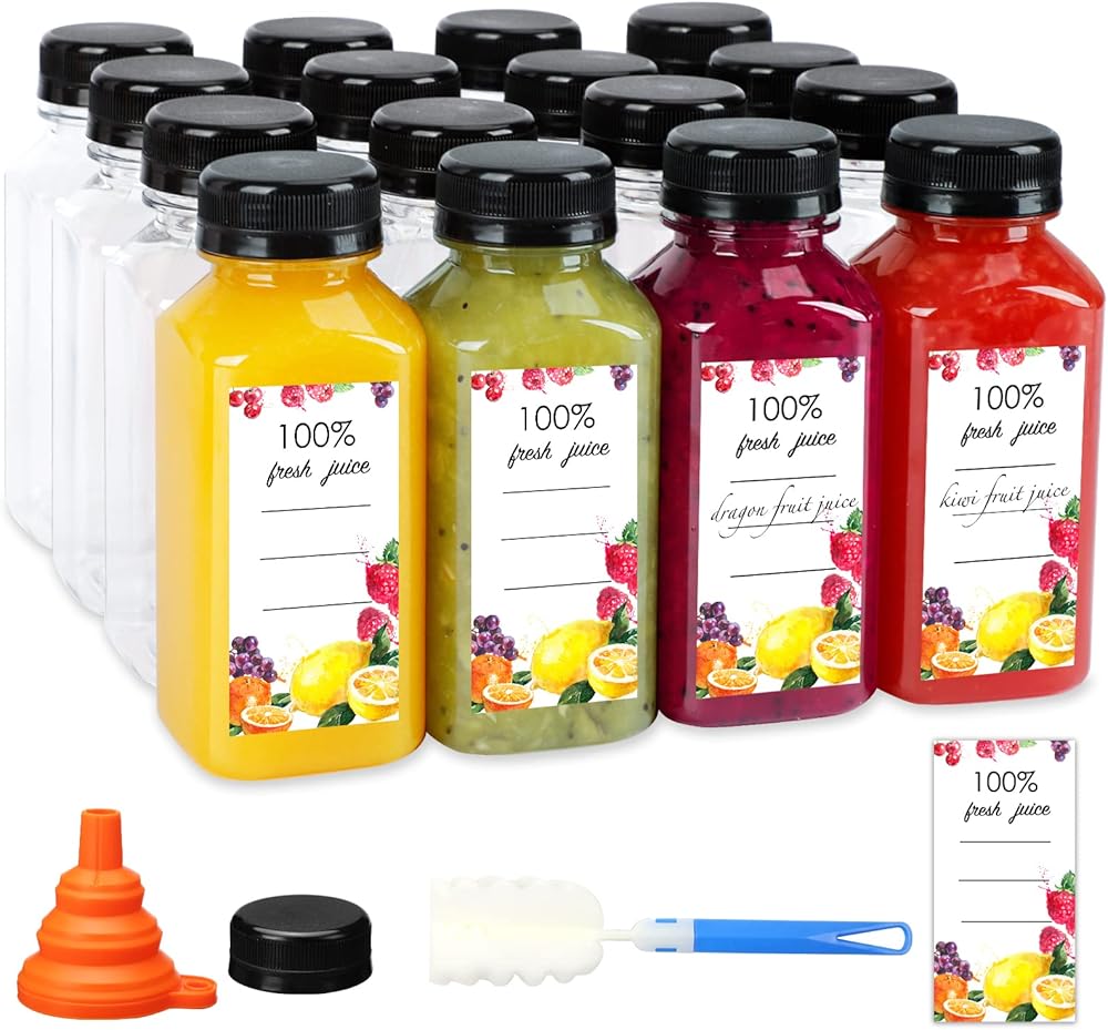 50 قطعة من الزجاجات البلاستيكية عالية الجودة بسعة 8 اونصة مع أغطية و50 غطاء أسود مقاوم للعبث وقمع وفرشاة وملصقات.