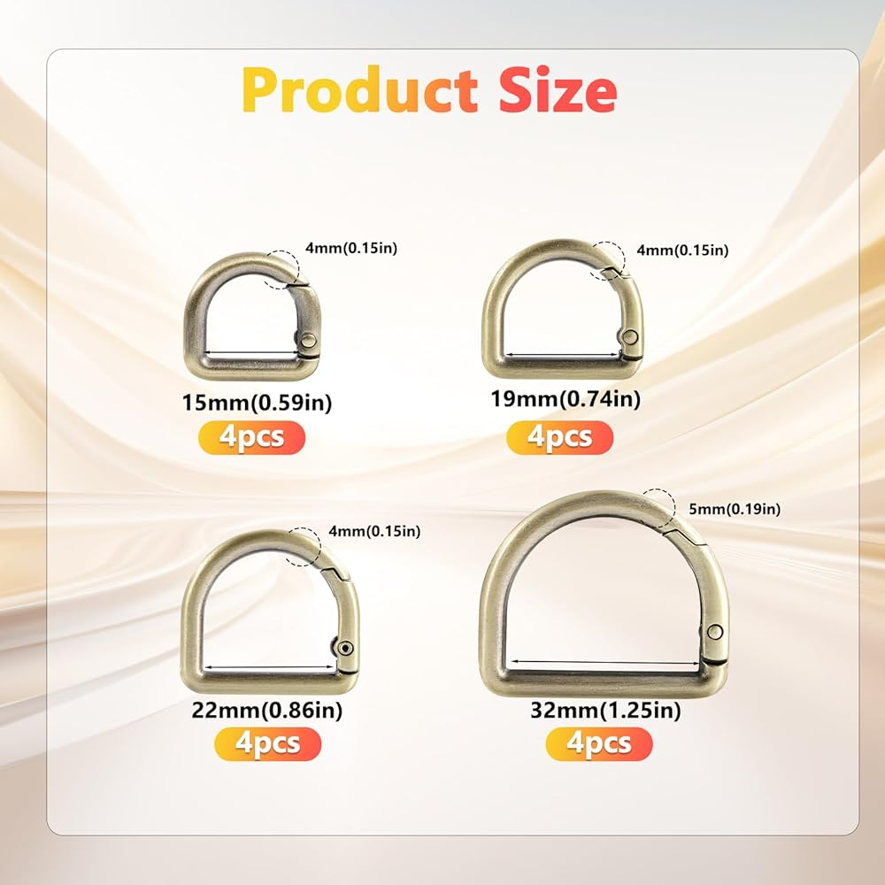 【 مقاس مختلف】القطر الداخلي للحلقة الربيعية على شكل حرف D: 0.59 بوصة (15 مم)/0.75 بوصة (19 مم)/0.86 (22 مم)/1.25 بوصة (32 مم). أحجام مختلفة من الحلقات على شكل حرف D مناسبة للحزام وسلاسل المفاتيح متعددة الأحجام.