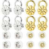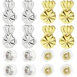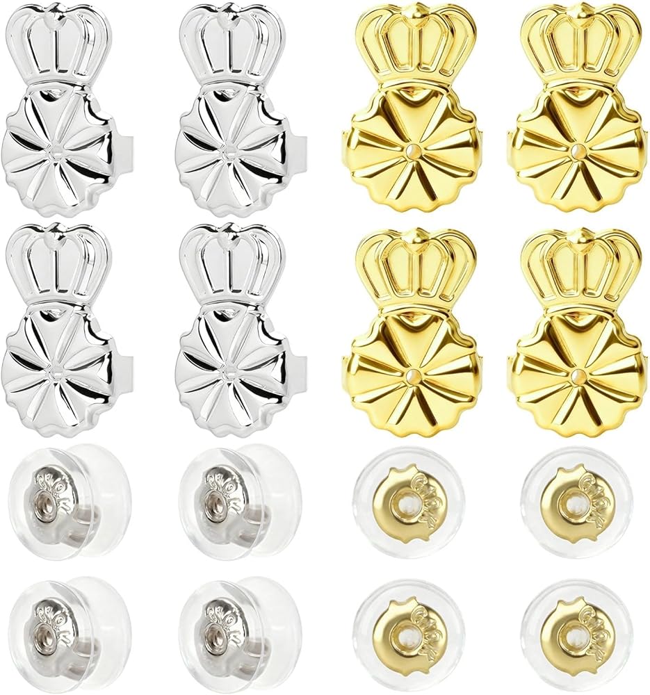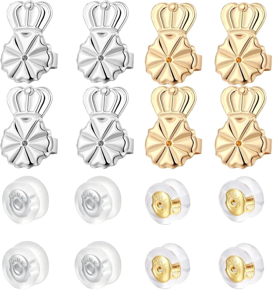 • 16 Pcs in Package: Total include 8 Pair/ 16 Pcs Earring back replacement, 2 Pairs Adjustable Gold Crown shaped Earring lifters, 2 Pairs Adjustable Silver Crown shaped Earring lifters, 2 Pairs gold silicone earring backs and 2 Pairs silver silicone earring backs for your choice