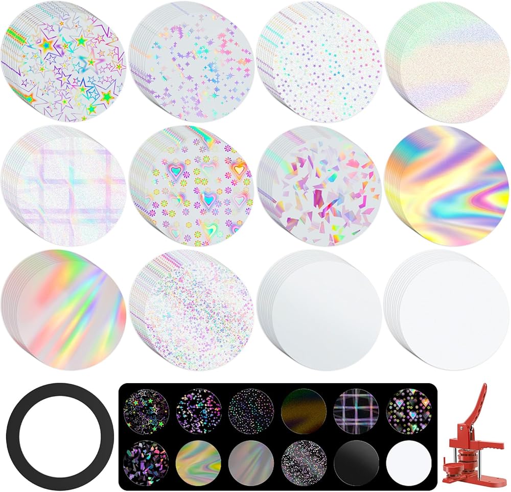 🌟【Sparkling & Unique DIY Projects】Stand out from the crowd! Our kit features 12 trendy holographic designs to choose from. The included blank paper allows for custom drawing or printing. All pieces are pre-cut into perfect 70mm circles, ready to use instantly with your 58mm (2.25 inch) button maker machine—no cutting needed. Watch your unique designs turn into professional-looking badges in seconds! (Please Note: These are protective films, NOT stickers. Please double-check your machine's required size before ordering.)