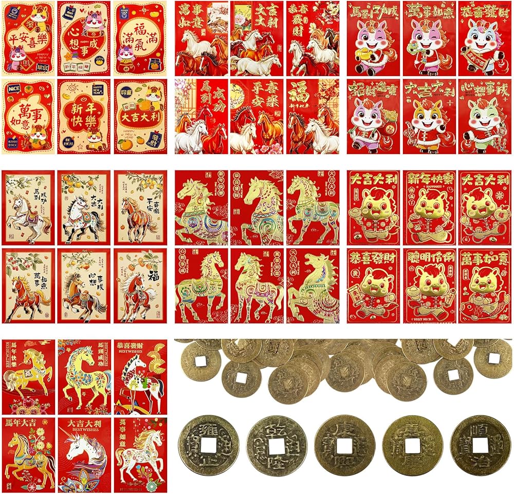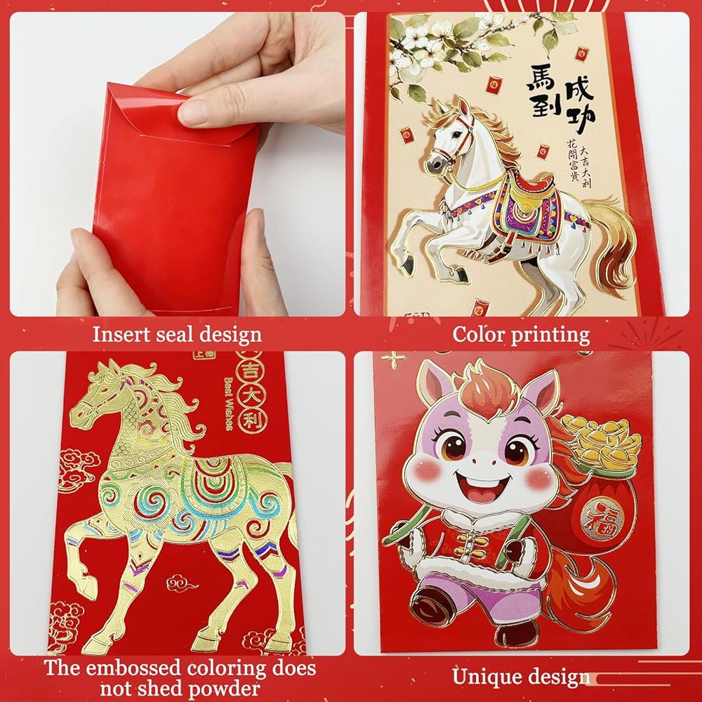 ما ستحصل عليه: تتضمن المجموعة 12 قطعة من الأظرف الحمراء ثلاثية الأبعاد لعام الحصان، وتتميز بتصميمين: 6 "الحظ الجيد على الفور" و6 "النجاح في المحاولة الأولى".