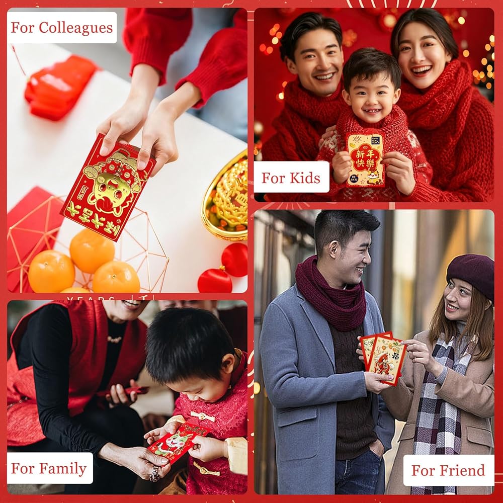 بركات العام الجديد 2026: ترمز المظاريف الحمراء للعام القمري الجديد المطبوعة بعبارات مثل "الحظ السعيد يزخر" و"سنة جديدة سعيدة" و"بركات في العام الجديد" إلى التوقعات المفعمة بالأمل والأمنيات القلبية للعام المقبل.