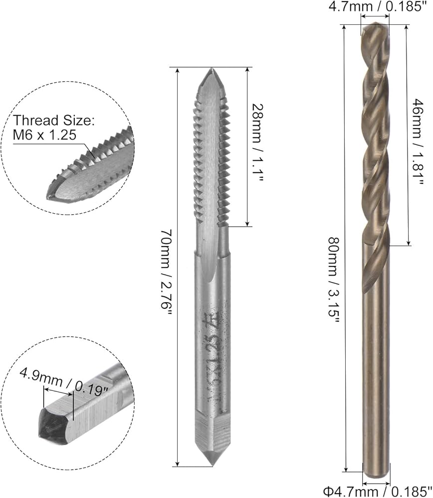 Tap & Bit Sets: Tap size: thread size: M6 x 1.25; accuracy: H2; total length: 70mm / 2.76". Drill bit size: cutting edge diameter: 4.7mm / 0.185"; total length: 80mm / 3.15".