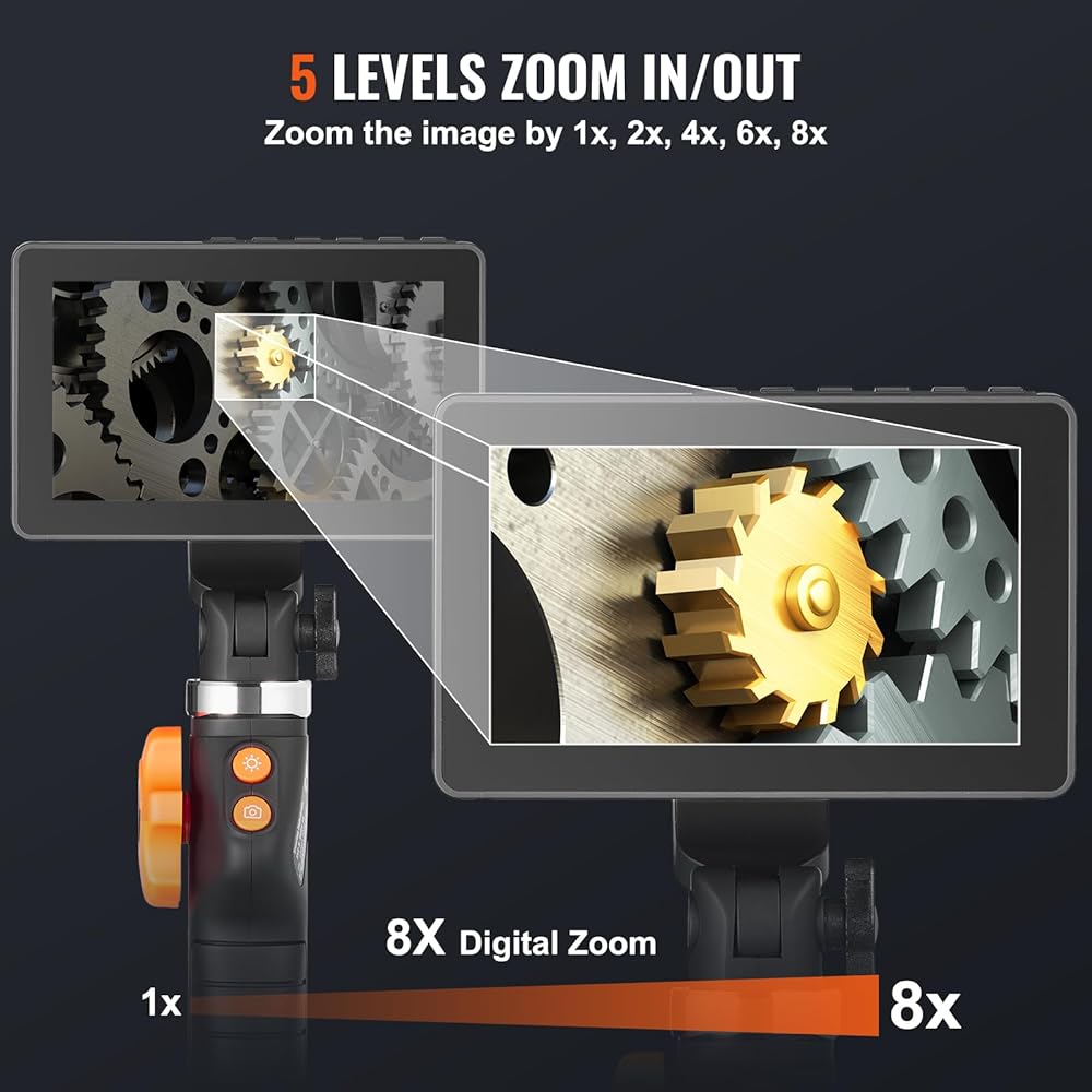 شاشة IPS شفافة مقاس 5 بوصات: توفر شاشة IPS الكبيرة مقاس 5 بوصات المحسنة صورة وفيديو عالي الوضوح بدقة 1080 بكسل بألوان حادة وحقيقية. ويمكن تكبير الصور بمقدار 1x، 2x، 4x، 6x، و8x، مما يسمح لك برؤية التفاصيل الداخلية بشكل أفضل. تعمل وظيفة تدوير الصورة الفريدة بزاوية 180 درجة على تسهيل المزيد من الراحة لعملك.
