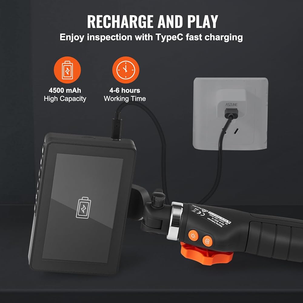 التشغيل لفترة أطول وتخزين المزيد: يمكن لكاميرا الفحص الخاصة بنا المزودة ببطارية عالية السعة بقدرة 4500 مللي أمبير في الساعة أن تدعم ما يصل إلى 4-6 ساعات من التشغيل المستمر. تتميز الواجهة من النوع C بسهولة التوصيل والفصل، وبمجرد الانتهاء، ما عليك سوى إعادة شحن الجهاز باستخدام شاحن USB المرفق. نقوم أيضًا بتضمين بطاقة TF بسعة 32 جيجابايت لتخزين الصور ومقاطع الفيديو لمزيد من التحليل.