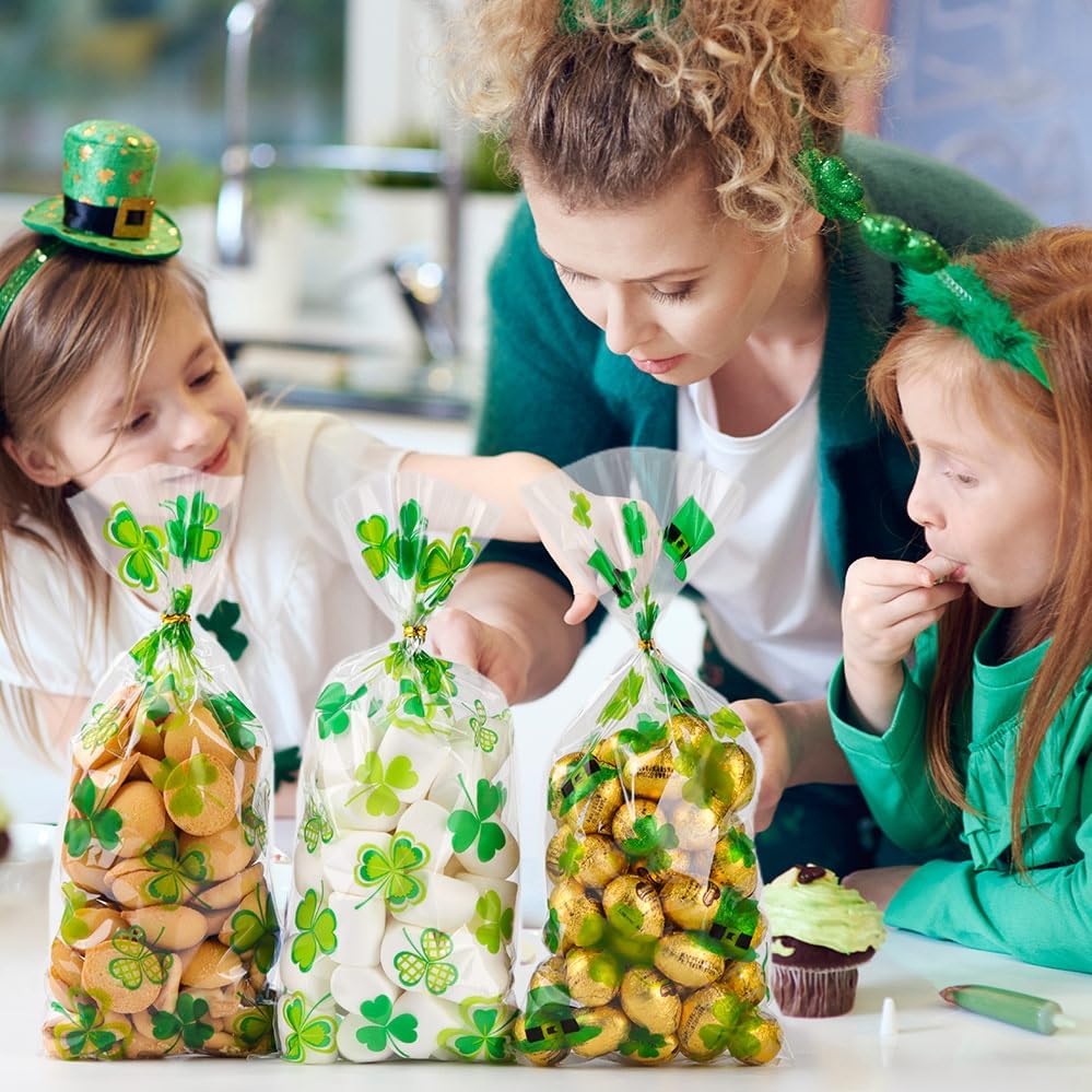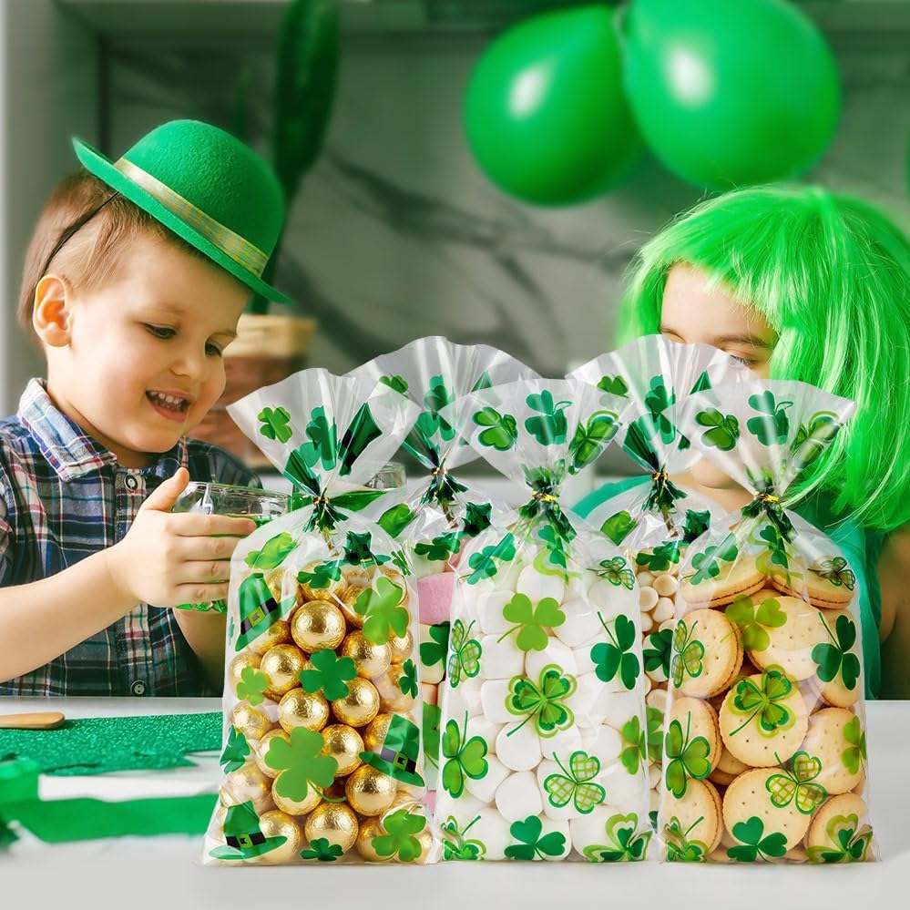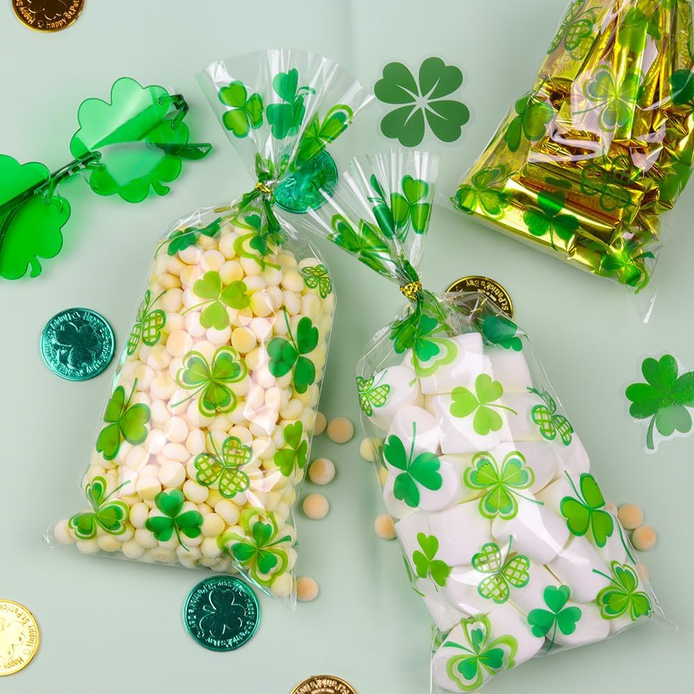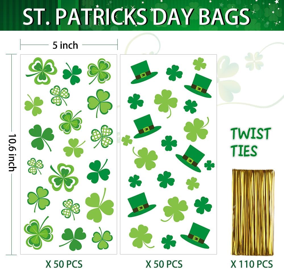 أكياس حلوى السيلوفان لعيد القديس باتريك من AREOK - 100 قطعة من حقائب هدايا Goodie لعيد القديس باتريك الشفاف للهدايا، حقيبة حلوى بلاستيكية لعيد القديس باتريك شامروك مع ربطات عنق