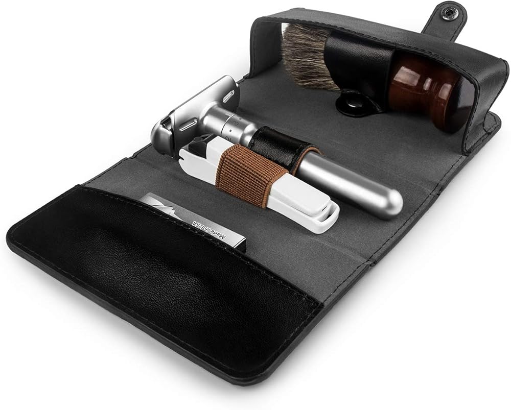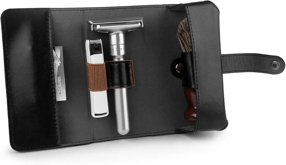 السفر دون فقدان: تم تصميم حقيبة السفر الجلدية المصنوعة يدويًا والمستوحاة من الطراز العتيق للحفاظ على مجموعة ماكينة الحلاقة المفضلة لديك آمنة بشكل مريح، سواء في المنزل أو أثناء السفر. يمكنها حمل ماكينة الحلاقة الآمنة (الطول في حدود 5 بوصات)، والشفرات، وقصافة الأظافر، والفرشاة.
