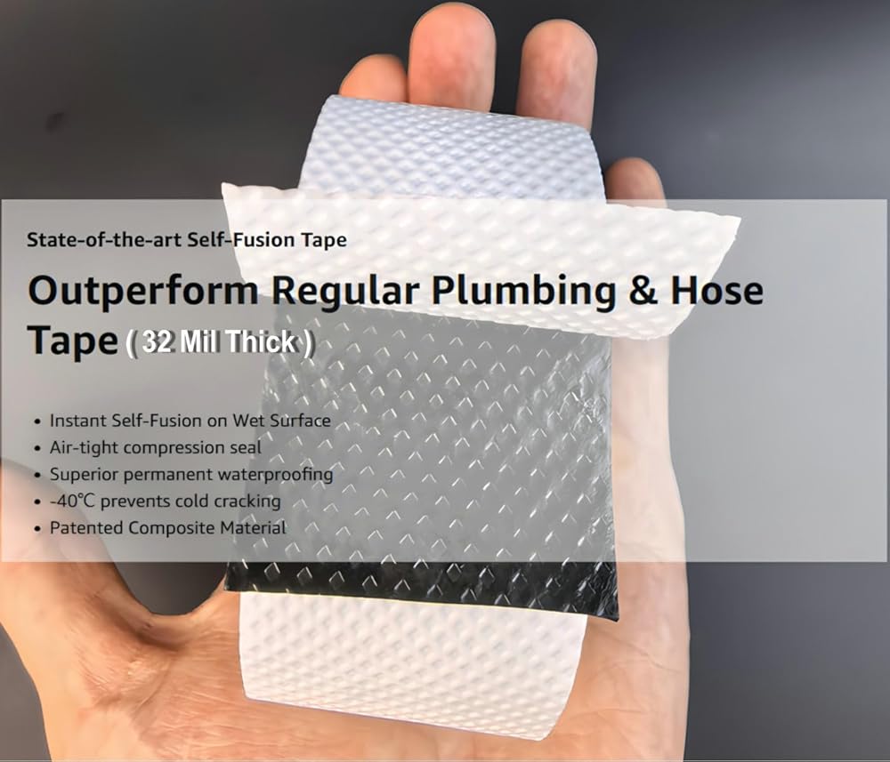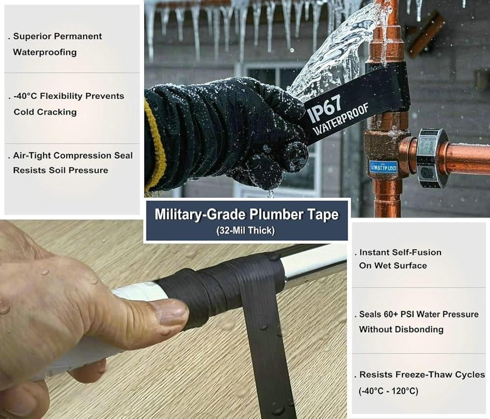 【ختم مقاوم للماء IP67 للبيئات القاسية 】 شريط مطاطي مركب بوتيل السيليكون المتطور يخلق ختم ضغط دائم، ويحقق تصنيف IP67 المقاوم للماء (غاطس 1 م/30 دقيقة). يتحمل -40 درجة فهرنهايت إلى 248 درجة فهرنهايت - مثالي لختم السباكة وإصلاح الخراطيم وإصلاح أنابيب الماء الساخن.